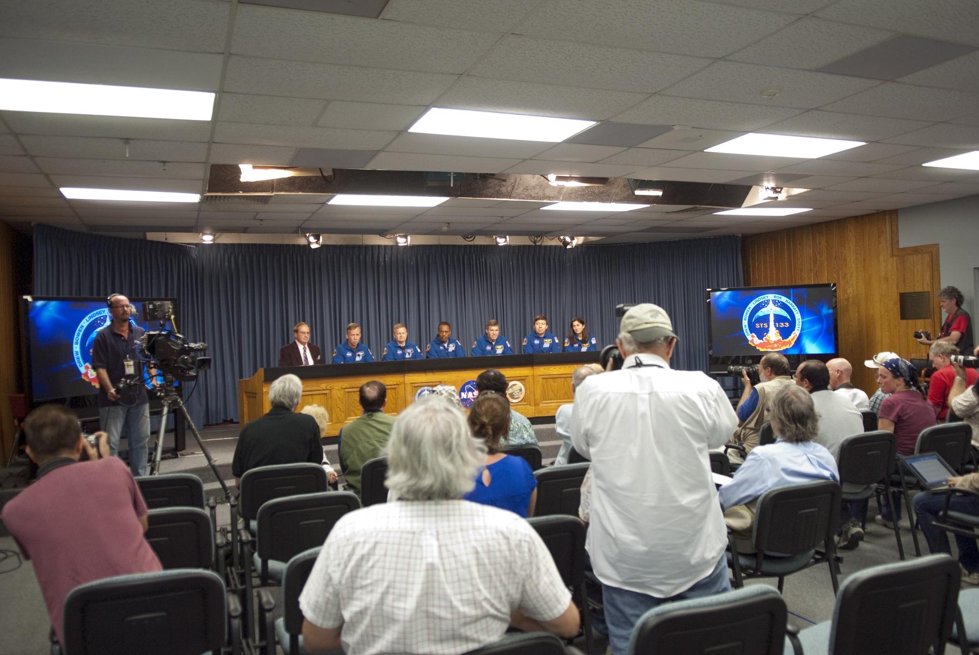CAPE CANAVERAL, Fla. -- The news media ask space shuttle Discovery's STS-133 crew members questions during a post-landing news conference in the Press Site TV Auditorium at NASA's Kennedy Space Center in Florida. From left, are NASA Public Affairs Officer George Diller, STS-133 Commander Steve Lindsey, Pilot Eric Boe, and Mission Specialists Alvin Drew, Steve Bowen, Michael Barratt and Nicole Stott. Discovery and crew landed on the Shuttle Landing Facility's Runway 15 at 11:57 a.m., completing a 13-day, 5.3-million-mile mission to the International Space Station. STS-133 delivered the Permanent Multipurpose Module, packed with supplies and critical spare parts, as well as Robonaut 2, the dexterous humanoid astronaut helper, to the orbiting outpost. STS-133 was Discovery's 39th and final mission. This was the 133rd Space Shuttle Program mission and the 35th shuttle voyage to the space station. Photo credit: NASA/Kim Shiflett