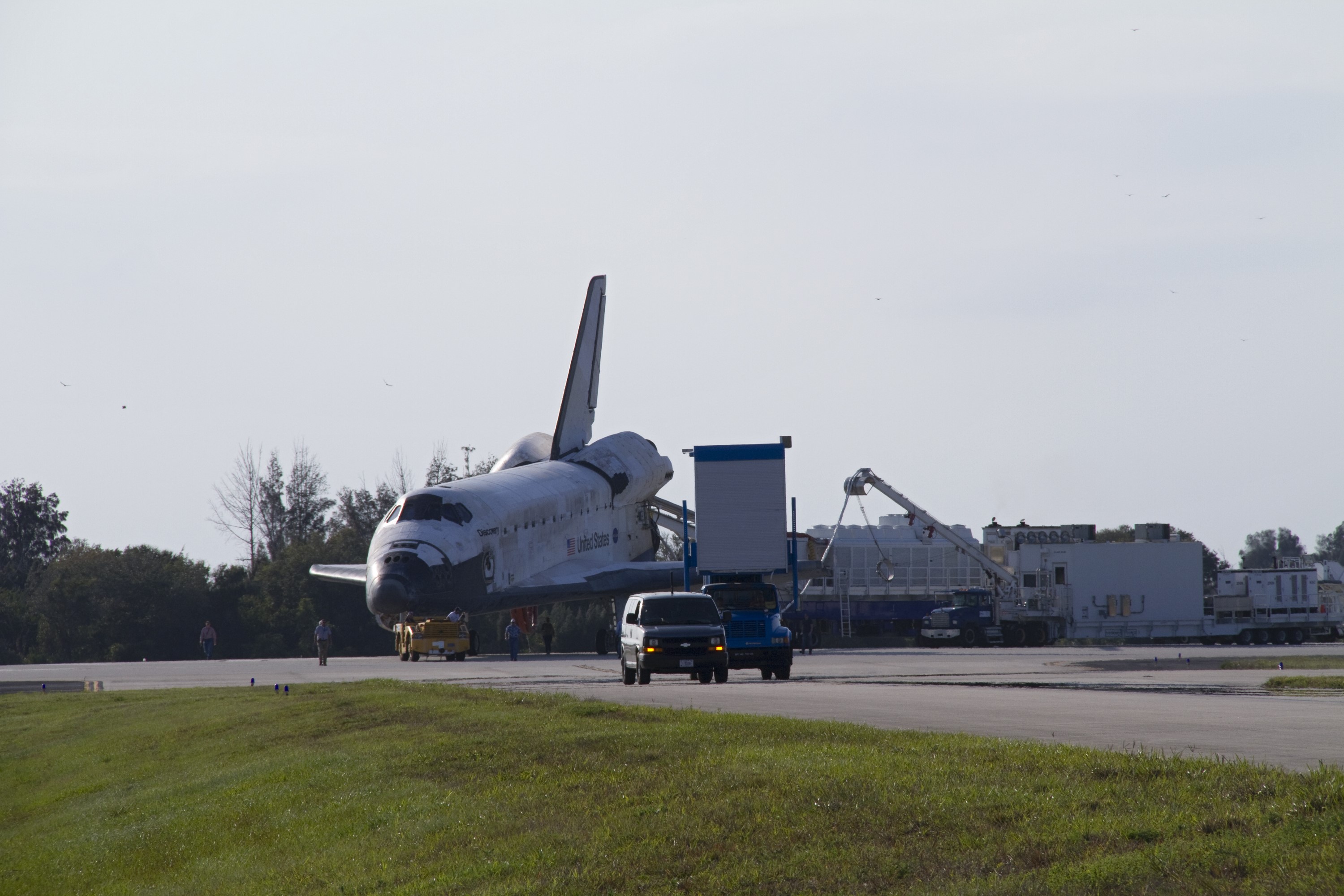 CAPE CANAVERAL, Fla. - Space shuttle Discovery and vehicles in the landing convoy enter the towway at NASA's Kennedy Space Center in Florida. The slow trip from the Shuttle Landing Facility to Orbiter Processing Facility-2 is under way. Discovery touched down on Runway 15 at 11:57 a.m., bringing an end to its 39th and final spaceflight mission, STS-133. Discovery and its six-member STS-133 crew delivered the Permanent Multipurpose Module, packed with supplies and critical spare parts, as well as Robonaut 2, the dexterous humanoid astronaut helper, to the International Space Station. Inside the processing facility, Discovery will be prepared for future public display. Photo credit: NASA/Jack Pfaller