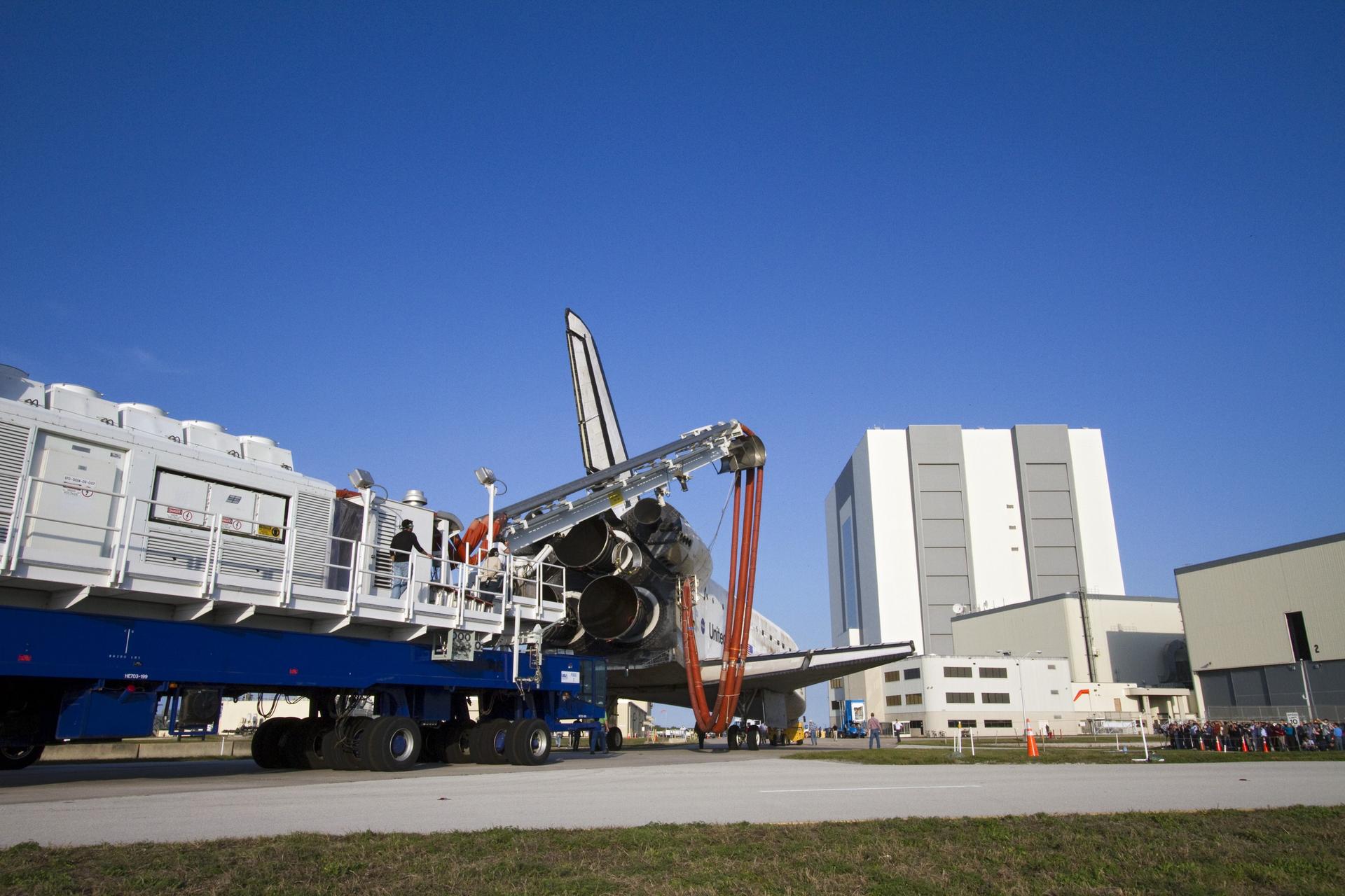 CAPE CANAVERAL, Fla. - Space shuttle Discovery, attached to a purge unit that pumps conditioned air into the shuttle while it is towed, approaches Orbiter Processing Facility-2 at NASA's Kennedy Space Center in Florida. Behind the processing bays is the 525-foot-tall Vehicle Assembly Building. Discovery touched down on the Shuttle Landing Facility's Runway 15 at 11:57 a.m., bringing an end to its 39th and final spaceflight mission, STS-133. Discovery and its six-member STS-133 crew delivered the Permanent Multipurpose Module, packed with supplies and critical spare parts, as well as Robonaut 2, the dexterous humanoid astronaut helper, to the International Space Station. Inside the processing facility, Discovery will be prepared for future public display. Photo credit: NASA/Jack Pfaller