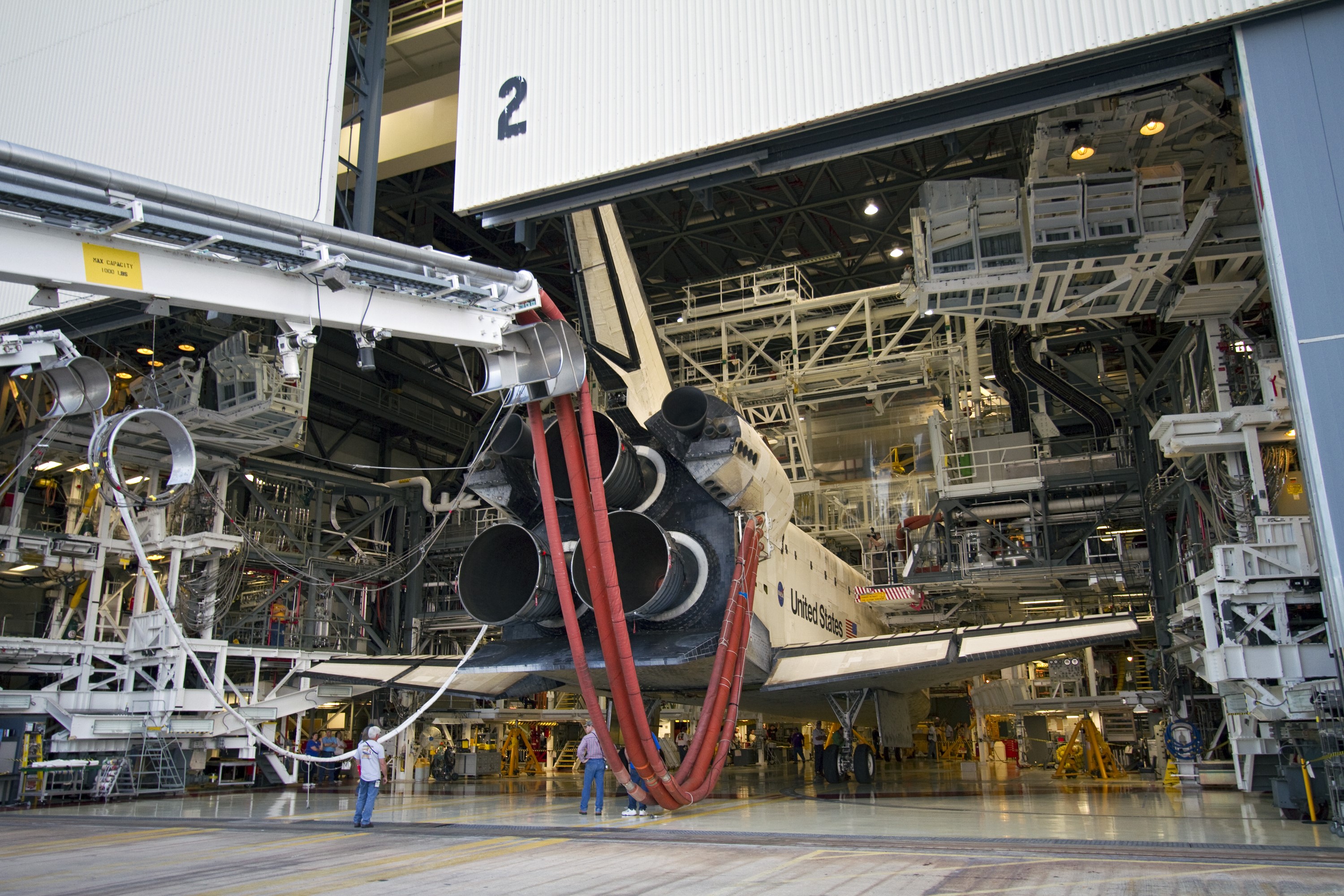CAPE CANAVERAL, Fla. - Space shuttle Discovery enters Orbiter Processing Facility-2 at NASA's Kennedy Space Center in Florida during a move called "towback." Discovery touched down on the Shuttle Landing Facility's Runway 15 at 11:57 a.m., bringing an end to its 39th and final spaceflight mission, STS-133. Discovery and its six-member STS-133 crew delivered the Permanent Multipurpose Module, packed with supplies and critical spare parts, as well as Robonaut 2, the dexterous humanoid astronaut helper, to the International Space Station. Inside the processing facility, Discovery will be prepared for future public display. Photo credit: NASA/Jack Pfaller