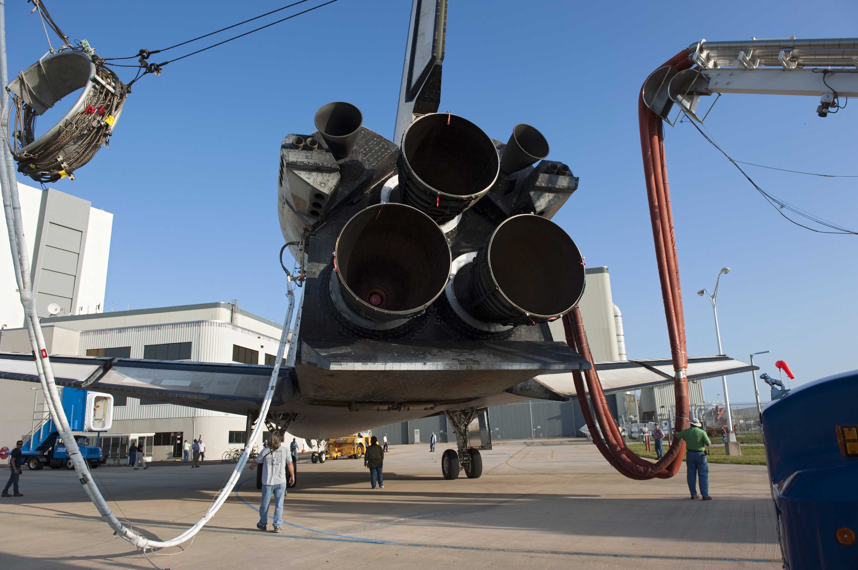 CAPE CANAVERAL, Fla. - The nozzles of two orbital maneuvering system pods and three space shuttle main engines protrude from the aft end of space shuttle Discovery as it is pulled by a "towback" vehicle toward Orbiter Processing Facility-2 at NASA's Kennedy Space Center in Florida. Discovery touched down on the Shuttle Landing Facility's Runway 15 at 11:57 a.m., bringing an end to its 39th and final spaceflight mission, STS-133. Discovery and its six-member STS-133 crew delivered the Permanent Multipurpose Module, packed with supplies and critical spare parts, as well as Robonaut 2, the dexterous humanoid astronaut helper, to the International Space Station. Inside the processing facility, Discovery will be prepared for future public display. Photo credit: NASA/Kim Shiflett