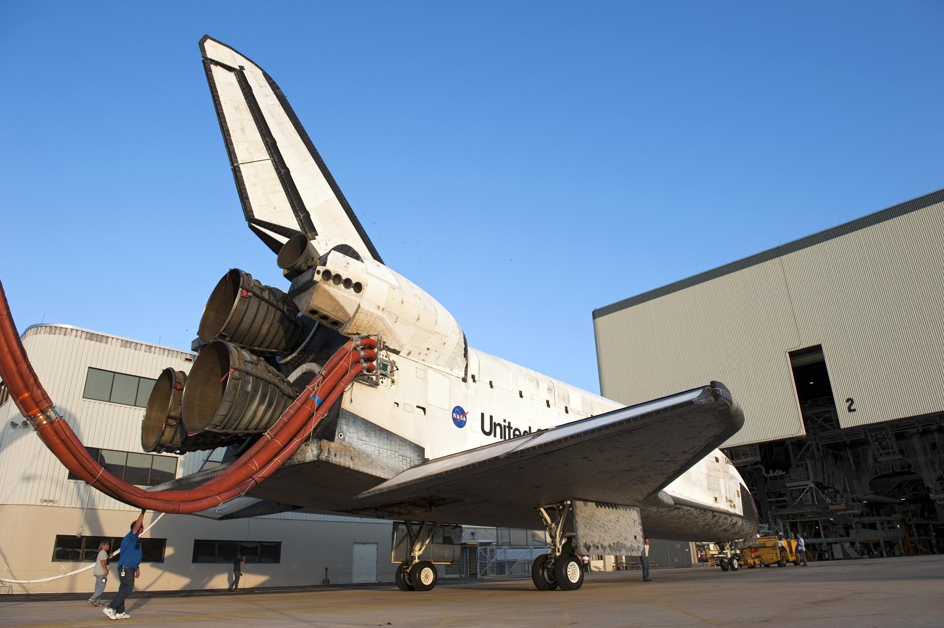 CAPE CANAVERAL, Fla. - Space shuttle Discovery noses its way toward the open hangar door of Orbiter Processing Facility-2 at NASA's Kennedy Space Center in Florida. Discovery touched down on the Shuttle Landing Facility's Runway 15 at 11:57 a.m., bringing an end to its 39th and final spaceflight mission, STS-133. Discovery and its six-member STS-133 crew delivered the Permanent Multipurpose Module, packed with supplies and critical spare parts, as well as Robonaut 2, the dexterous humanoid astronaut helper, to the International Space Station. Inside the processing facility, Discovery will be prepared for future public display. Photo credit: NASA/Kim Shiflett