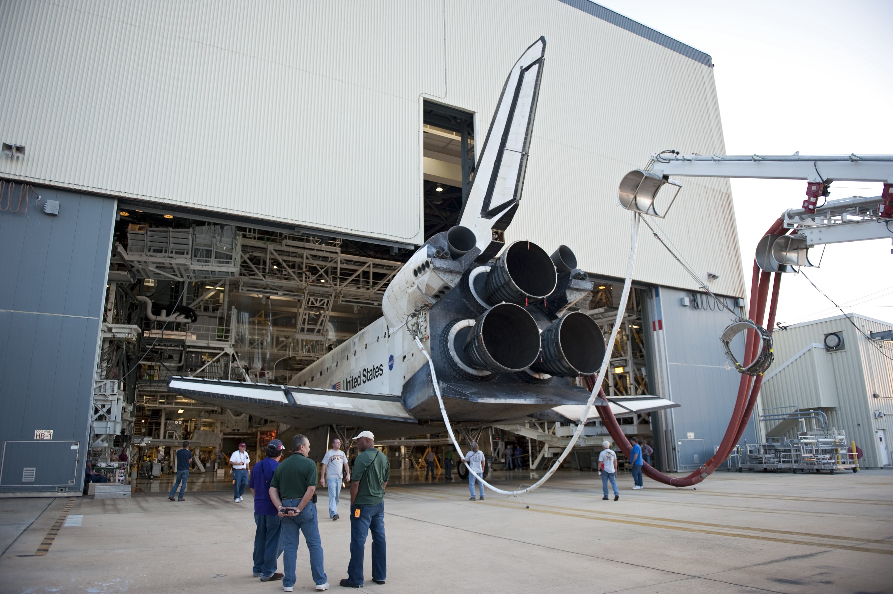 CAPE CANAVERAL, Fla. - Space shuttle Discovery is half in, half out of Orbiter Processing Facility-2 at NASA's Kennedy Space Center in Florida. Discovery touched down on the Shuttle Landing Facility's Runway 15 at 11:57 a.m., bringing an end to its 39th and final spaceflight mission, STS-133. Discovery and its six-member STS-133 crew delivered the Permanent Multipurpose Module, packed with supplies and critical spare parts, as well as Robonaut 2, the dexterous humanoid astronaut helper, to the International Space Station. Inside the processing facility, Discovery will be prepared for future public display. Photo credit: NASA/Kim Shiflett