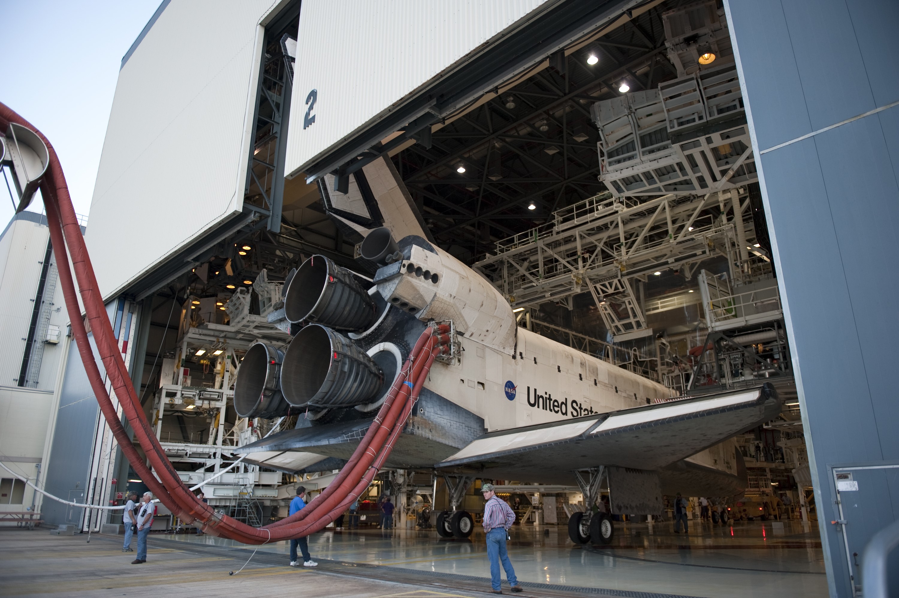 CAPE CANAVERAL, Fla. - Space shuttle Discovery's tail fin clears the hangar door of Orbiter Processing Facility-2 at NASA's Kennedy Space Center in Florida. Discovery touched down on the Shuttle Landing Facility's Runway 15 at 11:57 a.m., bringing an end to its 39th and final spaceflight mission, STS-133. Discovery and its six-member STS-133 crew delivered the Permanent Multipurpose Module, packed with supplies and critical spare parts, as well as Robonaut 2, the dexterous humanoid astronaut helper, to the International Space Station. Inside the processing facility, Discovery will be prepared for future public display. Photo credit: NASA/Kim Shiflett