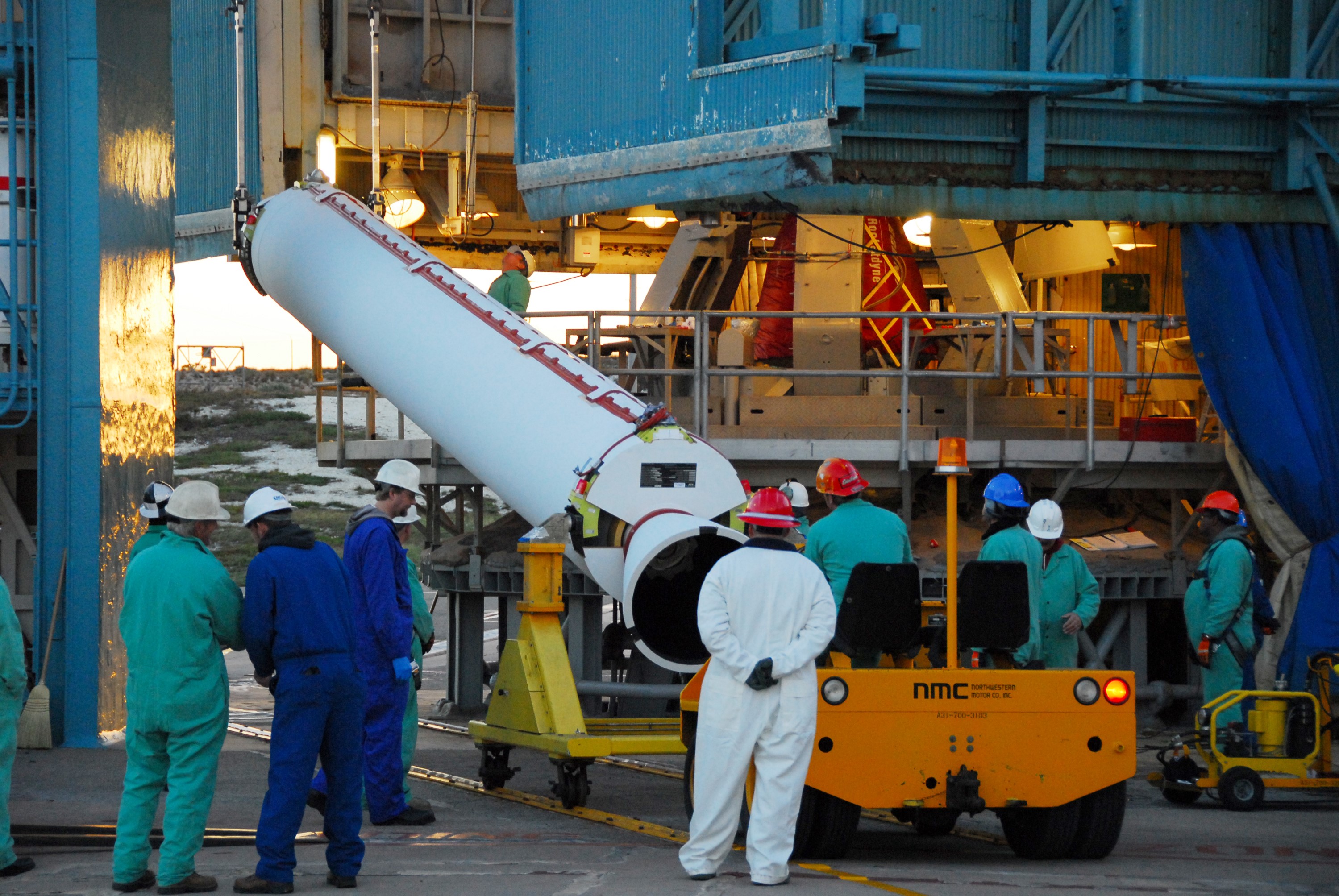 VANDENBERG AIR FORCE BASE, Calif. --As the sun rises over Vandenberg Air Force Base in California, a crane begins to raise one of three United Launch Alliance Delta II solid rocket motors on the pad at Space Launch Complex-2 West (SLC-2W). Scheduled to launch in June, the Delta II rocket will carry NASA's Aquarius satellite into low Earth orbit. Aquarius' mission will be to provide monthly maps of global changes in sea surface salinity. By measuring ocean salinity from space, Aquarius will provide new insights into how the massive natural exchange of freshwater between the ocean, atmosphere and sea ice influences ocean circulation, weather and climate. Also going up with the satellite are optical and thermal cameras, a microwave radiometer and the SAC-D spacecraft, which were developed with the help of institutions in Italy, France, Canada and Argentina. Photo credit: VAFB/30th Space Wing