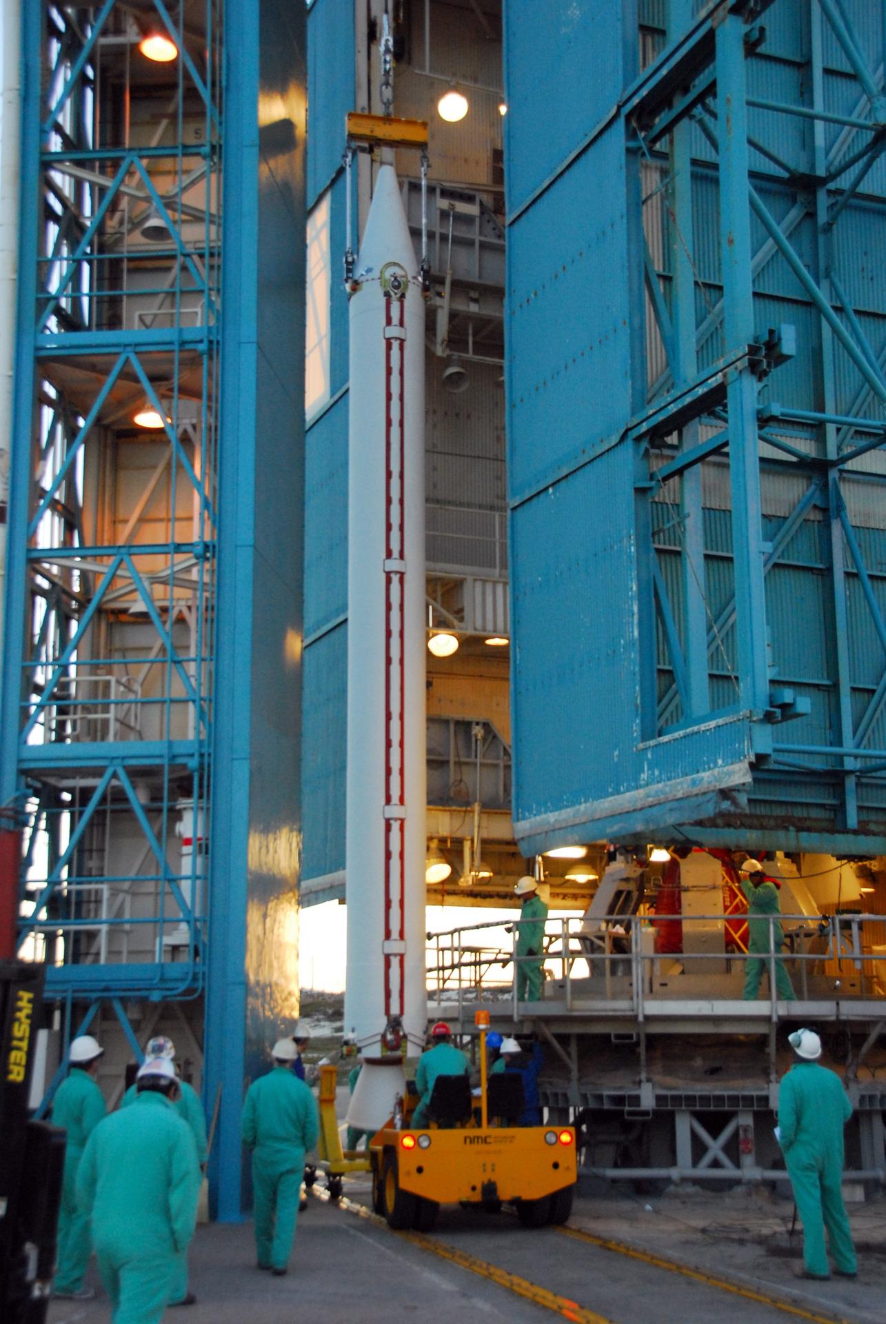 VANDENBERG AIR FORCE BASE, Calif. --As the sun rises over Vandenberg Air Force Base in California, a crane raises one of three United Launch Alliance Delta II solid rocket motors on the pad at Space Launch Complex-2 West (SLC-2W). Scheduled to launch in June, the Delta II rocket will carry NASA's Aquarius satellite into low Earth orbit. Aquarius' mission will be to provide monthly maps of global changes in sea surface salinity. By measuring ocean salinity from space, Aquarius will provide new insights into how the massive natural exchange of freshwater between the ocean, atmosphere and sea ice influences ocean circulation, weather and climate. Also going up with the satellite are optical and thermal cameras, a microwave radiometer and the SAC-D spacecraft, which were developed with the help of institutions in Italy, France, Canada and Argentina. Photo credit: VAFB/30th Space Wing
