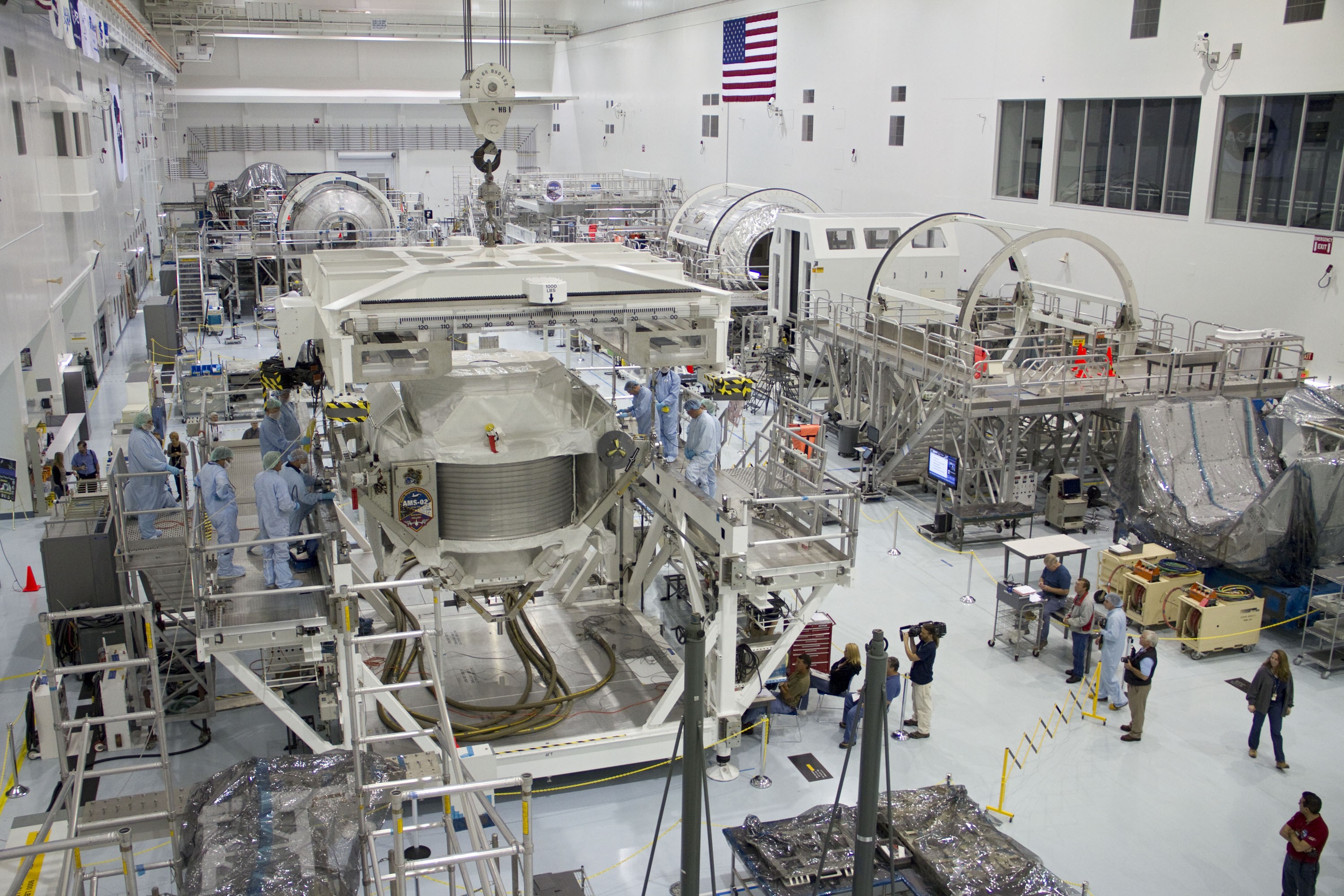 CAPE CANAVERAL, Fla. -- In the Space Station Processing Facility at NASA's Kennedy Space Center in Florida, the Alpha Magnetic Spectrometer-2 (AMS) was moved from its primary work stand to the weight and center of gravity stand where final measurements will be taken before launch. Next, AMS will be moved into a payload canister. The canister will protect the space-bound payload on its journey to Launch Pad 39A, where it will later be installed into space shuttle Endeavour’s payload bay. AMS is a particle physics detector, designed to operate as an external experiment on the International Space Station. It will use the unique environment of space to study the universe and its origin by searching for dark matter. AMS-2 will fly to the station aboard Endeavour's STS-134 mission targeted to launch April 19 at 7:48 p.m. EDT. For more information visit, www.nasa.gov/mission_pages/shuttle/shuttlemissions/sts134/index.html. Photo credit: NASA/Jack Pfaller
