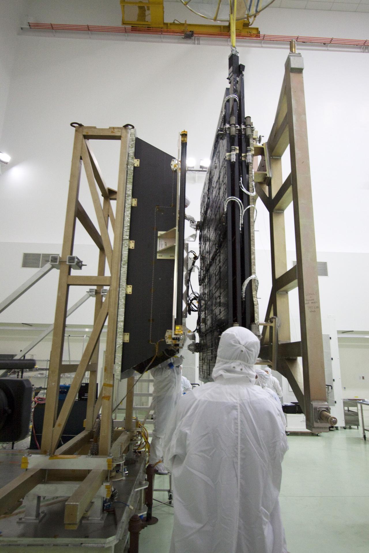 CAPE CANAVERAL, Fla. -- Technicians in the Astrotech payload processing facility in Titusville, Fla., prepare to unfurl solar array No. 1 with a magnetometer boom that will help power NASA's Juno spacecraft on a mission to Jupiter. Power-generating panels on three sets of solar arrays will extend outward from Juno’s hexagonal body, giving the overall spacecraft a span of more than 66 feet in order to operate at such a great distance from the sun. Juno is scheduled to launch aboard an Atlas V rocket from Cape Canaveral, Fla., on Aug. 5, 2011, reaching Jupiter in July 2016. The spacecraft will orbit the giant planet more than 30 times, skimming to within 3,000 miles above its cloud tops, for about one year. With its suite of science instruments, the spacecraft will investigate the existence of a solid planetary core, map Jupiter's intense magnetic field, measure the amount of water and ammonia in the deep atmosphere, and observe the planet's auroras. For more information visit, www.nasa.gov/juno. Photo credit: NASA/Jack Pfaller