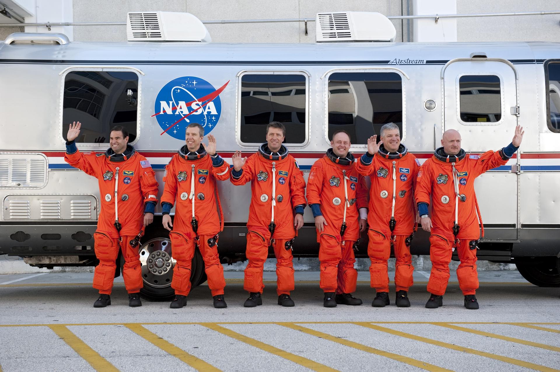 CAPE CANAVERAL, Fla. -- During a simulated launch countdown, the STS-134 crew pause for a photo opportunity before climbing onboard the Astrovan at NASA's Kennedy Space Center in Florida. As part of the Terminal Countdown Demonstration Test (TCDT), the crew members ride to Kennedy's Launch Pad 39A in the silver vehicle and strap into space shuttle Endeavour to practice the steps that will be taken on launch day. From right to left are, Commander Mark Kelly, Pilot Greg H. Johnson , Mission Specialist Mike Fincke, Roberto Vittori, European Space Agency astronaut, and Mission Specialists Andrew Feustel and Greg Chamitoff. Endeavour's six crew members are targeted to launch April 19 at 7:48 p.m. EDT. They will deliver the Express Logistics Carrier-3, Alpha Magnetic Spectrometer-2 (AMS), a high-pressure gas tank, additional spare parts for the Dextre robotic helper and micrometeoroid debris shields to the International Space Station. This will be the final spaceflight for Endeavour. For more information visit, www.nasa.gov/mission_pages/shuttle/shuttlemissions/sts134/index.html. Photo credit: NASA/Kim Shiflett