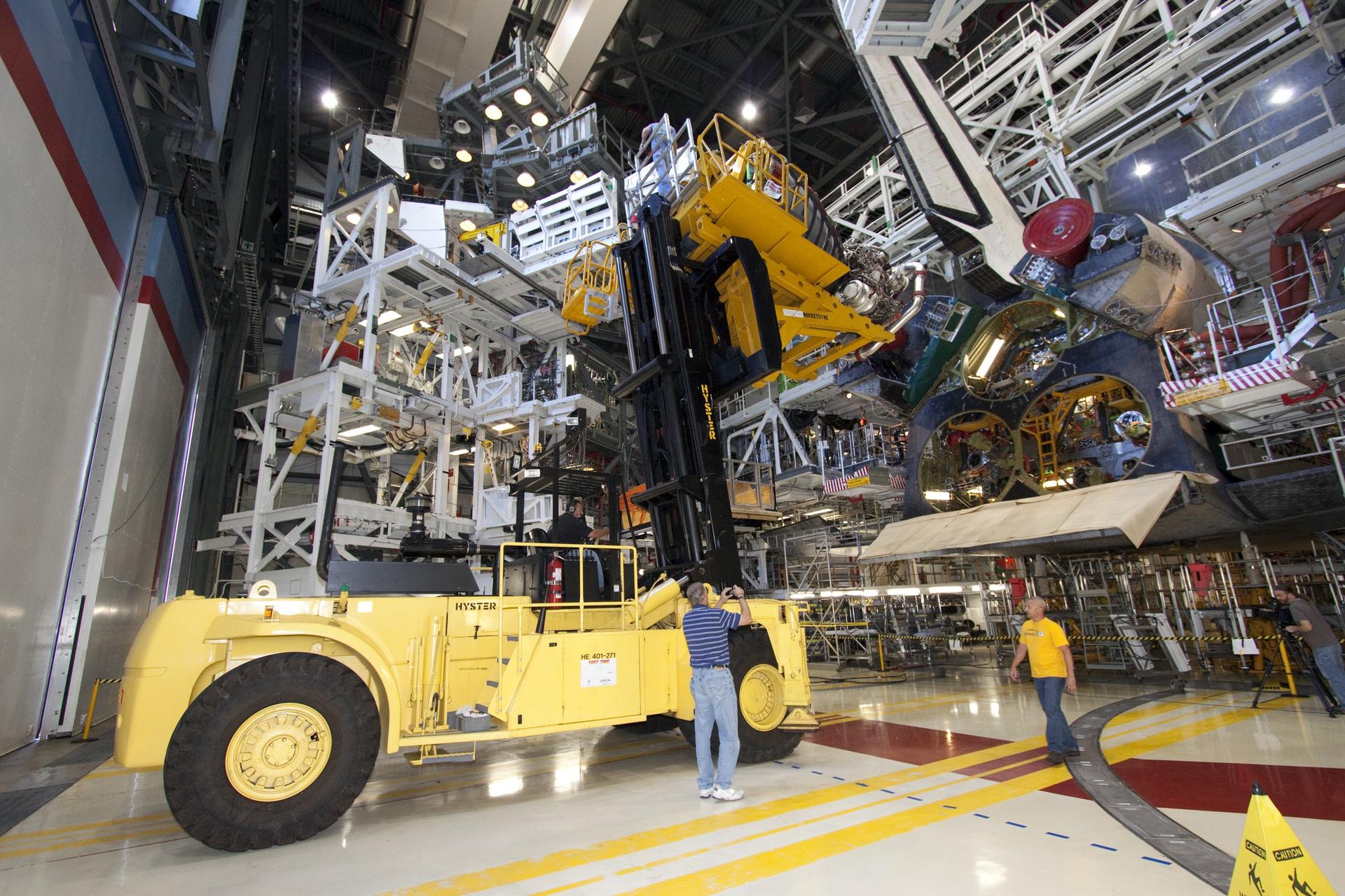 CAPE CANAVERAL, Fla. - Technicians complete the removal of main engine No. 1 from space shuttle Discovery using a specially designed engine installer, called a Hyster forklift. The work is taking place in Orbiter Processing Facility-2 at NASA's Kennedy Space Center in Florida. The removal is part of Discovery's transition and retirement processing. Work performed on Discovery is expected to help rocket designers build next-generation spacecraft and prepare the shuttle for future public display. Photo credit: NASA/Jack Pfaller