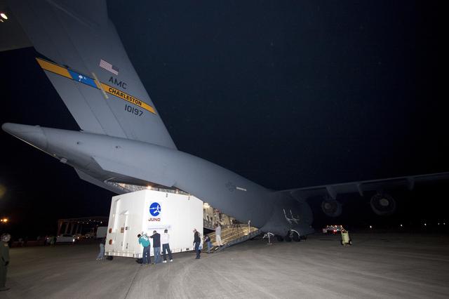 CAPE CANAVERAL, Fla. -- Workers move the container holding NASA's Juno spacecraft away from the ramp of an Air Force C-17 jet at Kennedy Space Center's Shuttle Landing Facility in Florida. Juno was shipped from Lockheed Martin Space Systems in Denver and will be transported to Astrotech's payload processing facility in Titusville, Fla. to begin final preparations for launch. The solar-powered spacecraft will orbit Jupiter's poles 33 times to find out more about the gas giant's origins, structure, atmosphere and magnetosphere and investigate the existence of a solid planetary core. Juno is scheduled to launch aboard an Atlas V rocket from Cape Canaveral, Fla. Aug. 5. For more information visit, www.nasa.gov/juno. Photo credit: NASA/Jack Pfaller