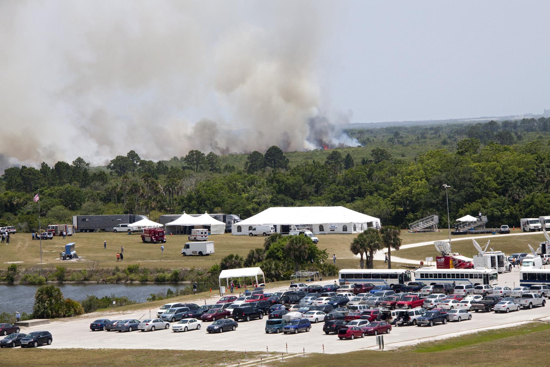 CAPE CANAVERAL, Fla. -- At NASA's Kennedy Space Center in Florida, smoke rises from a smoldering brush fire southeast of the Turn Basin. The fire was spotted near Kennedy’s Press Site approximately three miles away from Launch Pad 39A. The fires are being contained by firefighters from Kennedy Space Center and the U.S. Fish and Wildlife Service. No personnel are in danger and currently there is no to impact any operations related to space shuttle Endeavour’s launch countdown. Photo credit: NASA/Jack Pfaller