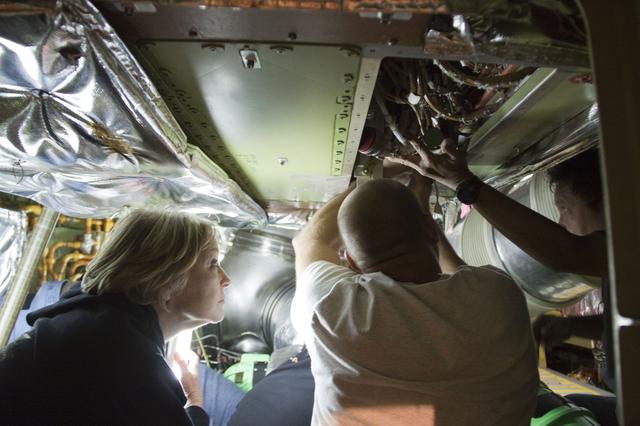 CAPE CANAVERAL, Fla. -- At NASA Kennedy Space Center's Launch Pad 39A, technicians begin to remove the Load Control Assembly-2 (LCA-2) from inside space shuttle Endeavour's aft section. Located in the orbiter's aft avionics bay 5, the LCA-2 assembly, which feeds power to the fuel line heaters, is believed to have caused the heaters for Endeavour's auxiliary power unit-1 (APU-1) to fail April 29 during the first launch attempt for the STS-134 mission. The assembly will be replaced and systems will be retested before the launch is rescheduled. STS-134 will deliver the Express Logistics Carrier-3, Alpha Magnetic Spectrometer-2 (AMS), a high-pressure gas tank and additional spare parts for the Dextre robotic helper to the International Space Station. The mission also will be the final spaceflight for Endeavour. For more information, visit www.nasa.gov/mission_pages/shuttle/shuttlemissions/sts134/index.html. Photo credit: NASA/Troy Cryder