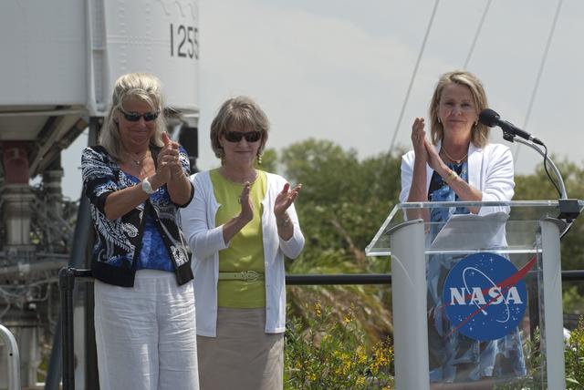 CAPE CANAVERAL, Fla. -- In the Rocket Garden at NASA's Kennedy Space Center Visitor Complex in Florida, Laura Churchley (left), Alice Wackerman and Julie Jenkins, daughters of Mercury Astronaut Alan Shepard, applaud during an event unveiling two new stamps to commemorate the 50th anniversary of human spaceflight from the United States Postal Service. One stamp commemorates NASA's Project Mercury and Alan Shepard's historic launch on May 5, 1961, aboard the spacecraft Freedom 7. The second stamp honors NASA's MESSENGER, which reached Mercury in March to become the first spacecraft to orbit the planet. The two missions frame a remarkable 50-year period in which America advanced space exploration through more than 1,500 crewed and uncrewed flights. Photo credit: NASA/Kim Shiflett