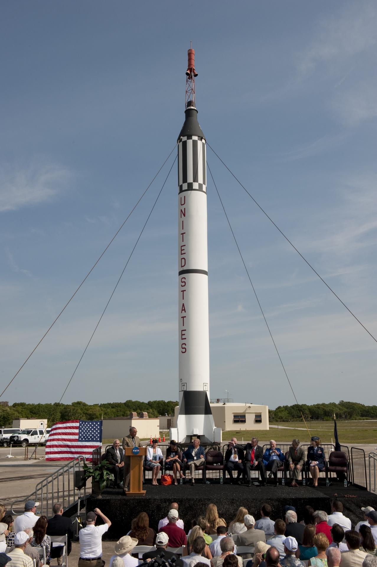 CAPE CANAVERAL, Fla. -- NASA Administrator Charlie Bolden addresses the audience during a celebration at Complex 5/6 on Cape Canaveral Air Force Station in Florida. The celebration was held at the launch site of the first U.S. manned spaceflight May 5, 1961, to mark the 50th anniversary of the flight. Fifty years ago, astronaut Alan Shepard lifted off inside the Mercury capsule, "Freedom 7," atop an 82-foot-tall Mercury-Redstone rocket at 9:34 a.m. EST, sending him on a remarkably successful, 15-minute suborbital flight. The event was attended by more than 200 workers from the original Mercury program and included a re-creation of Shepard's flight and recovery, as well as a tribute to his contributions as a moonwalker on the Apollo 14 lunar mission. For more information, visit www.nasa.gov/topics/history/milestones/index.html. Photo credit: NASA/Kim Shiflett