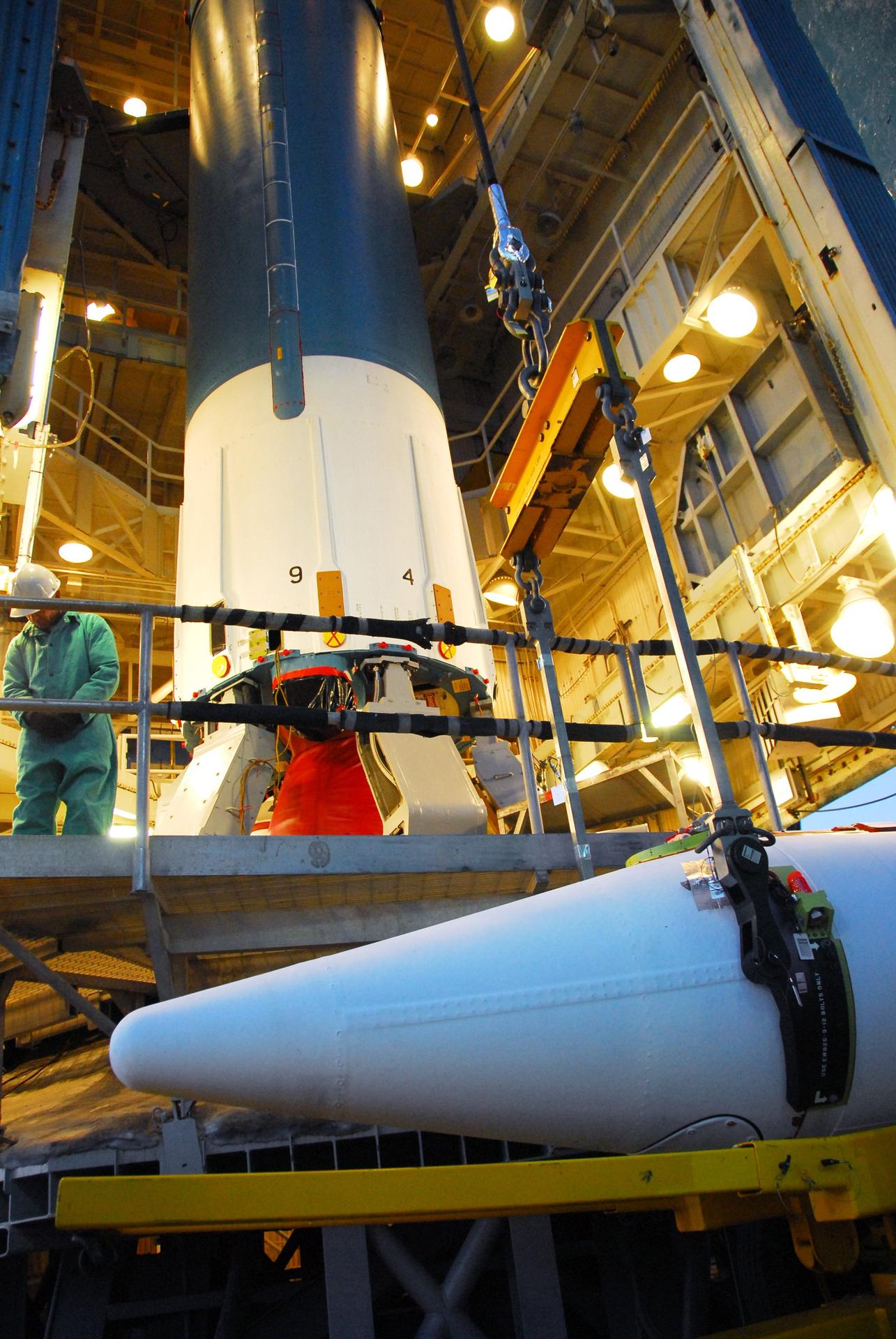 VANDENBERG AIR FORCE BASE, Calif. -- With the aid of an overhead crane workers lift one of three United Launch Alliance Delta II solid rocket motors into the service tower at NASA's Space Launch Complex-2 (SLC-2) at Vandenberg Air Force Base in California. Following final tests, the spacecraft will be integrated to the Delta II in preparation for the targeted June launch. Aquarius, the NASA-built instrument on the SAC-D spacecraft will provide new insights into how variations in ocean surface salinity relate to fundamental climate processes on its three-year mission. Photo credit: NASA/VAFB