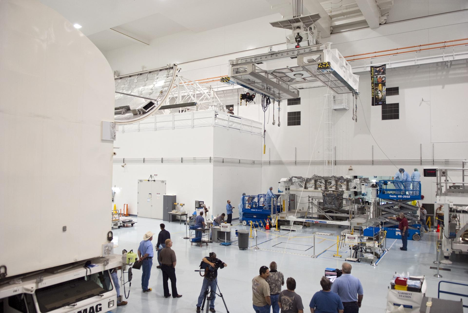 CAPE CANAVERAL, Fla. - In the Space Station Processing Facility at NASA's Kennedy Space Center in Florida technicians attach cables from an overhead crane to the Lightweight Multi-Purpose Experiment Support Structure Carrier, or LMC, for its move to a payload canister. The canister then will be installed into Atlantis' payload bay. Commander Chris Ferguson, Pilot Doug Hurley and Mission Specialists Sandra Magnus and Rex Walheim are targeted to lift off on July 8, taking with them the Raffaello multi-purpose logistics module packed with supplies, logistics and spare parts. The STS-135 mission also will fly a system to investigate the potential for robotically refueling existing spacecraft and return a failed ammonia pump module to help NASA better understand the failure mechanism and improve pump designs for future systems. STS-135 will be the 33rd flight of Atlantis, the 37th shuttle mission to the space station, and the 135th and final mission of NASA's Space Shuttle Program. For more information visit, www.nasa.gov/mission_pages/shuttle/shuttlemissions/sts135/index.html. Photo credit: NASA/Jim Grossmann