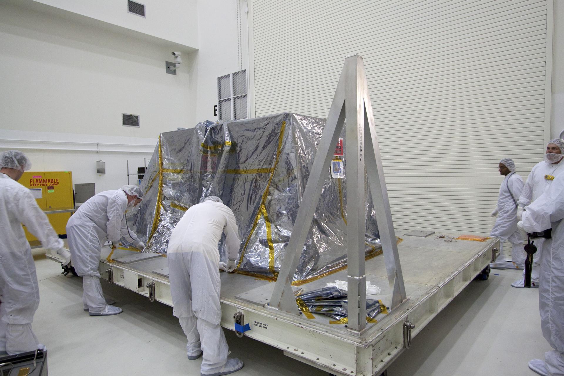 CAPE CANAVERAL, Fla. -- Technicians in the Astrotech payload processing facility in Titusville, Fla., remove the protective cover from NASA's Gravity Recovery and Interior Laboratory, or GRAIL, twin spacecraft to begin testing and processing. GRAIL was built at the Lockheed Martin plant in Denver, Colo. The United Launch Alliance Delta II rocket that will carry GRAIL into lunar orbit already is fully stacked at NASA's Space Launch Complex 17B and launch is scheduled for Sept. 8. The GRAIL mission is a part of NASA's Discovery Program. GRAIL will fly twin spacecraft in tandem orbits around the moon for several months to measure its gravity field. The mission also will answer longstanding questions about Earth's moon and provide scientists a better understanding of how Earth and other rocky planets in the solar system formed. For more information, visit http://science.nasa.gov/missions/grail/. Photo credit: NASA/Jack Pfaller