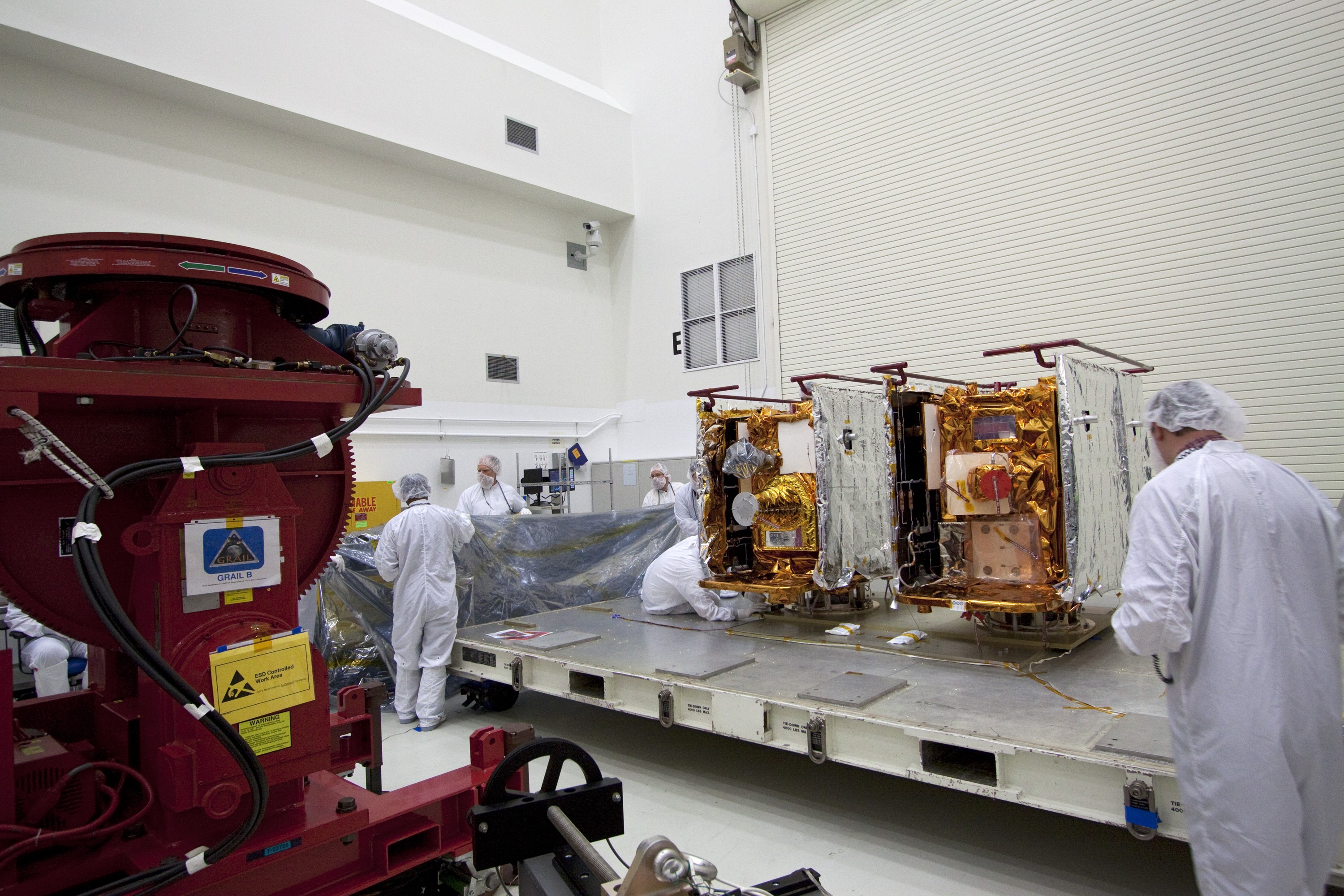 CAPE CANAVERAL, Fla. -- Technicians in the Astrotech payload processing facility in Titusville, Fla., prepare NASA's Gravity Recovery and Interior Laboratory, or GRAIL, twin spacecraft for testing and processing. GRAIL was built at the Lockheed Martin plant in Denver, Colo. The United Launch Alliance Delta II rocket that will carry GRAIL into lunar orbit already is fully stacked at NASA's Space Launch Complex 17B and launch is scheduled for Sept. 8. The GRAIL mission is a part of NASA's Discovery Program. GRAIL will fly twin spacecraft in tandem orbits around the moon for several months to measure its gravity field. The mission also will answer longstanding questions about Earth's moon and provide scientists a better understanding of how Earth and other rocky planets in the solar system formed. For more information, visit http://science.nasa.gov/missions/grail/. Photo credit: NASA/Jack Pfaller