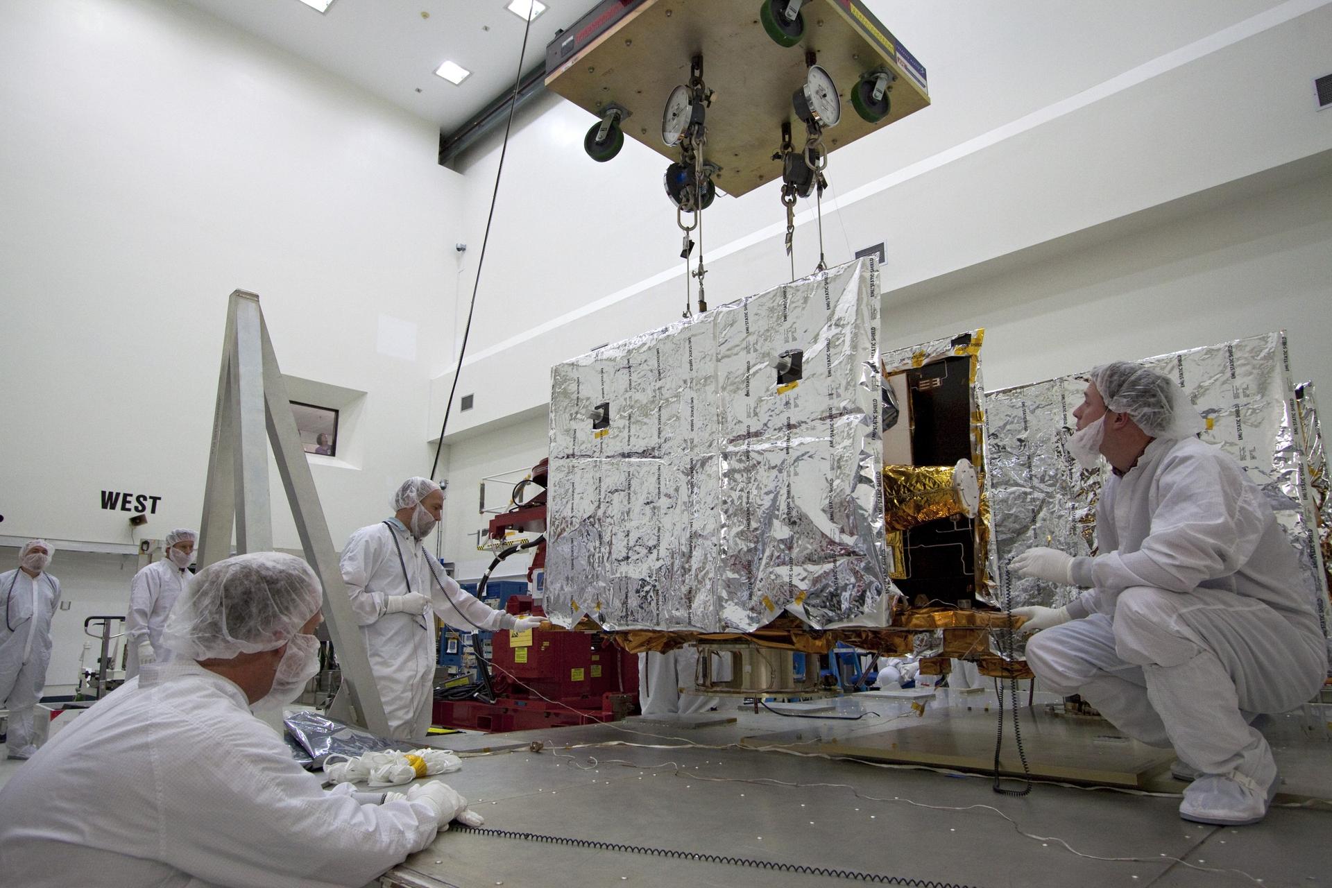 CAPE CANAVERAL, Fla. -- Technicians begin to lift one of two spacecraft for NASA's Gravity Recovery and Interior Laboratory, or GRAIL, to a test stand in the Astrotech payload processing facility in Titusville, Fla. The twin spacecraft were built at the Lockheed Martin plant in Denver, Colo. The United Launch Alliance Delta II rocket that will carry GRAIL into lunar orbit already is fully stacked at NASA's Space Launch Complex 17B and launch is scheduled for Sept. 8. The GRAIL mission is a part of NASA's Discovery Program. GRAIL will fly twin spacecraft in tandem orbits around the moon for several months to measure its gravity field. The mission also will answer longstanding questions about Earth's moon and provide scientists a better understanding of how Earth and other rocky planets in the solar system formed. For more information, visit http://science.nasa.gov/missions/grail/. Photo credit: NASA/Jack Pfaller