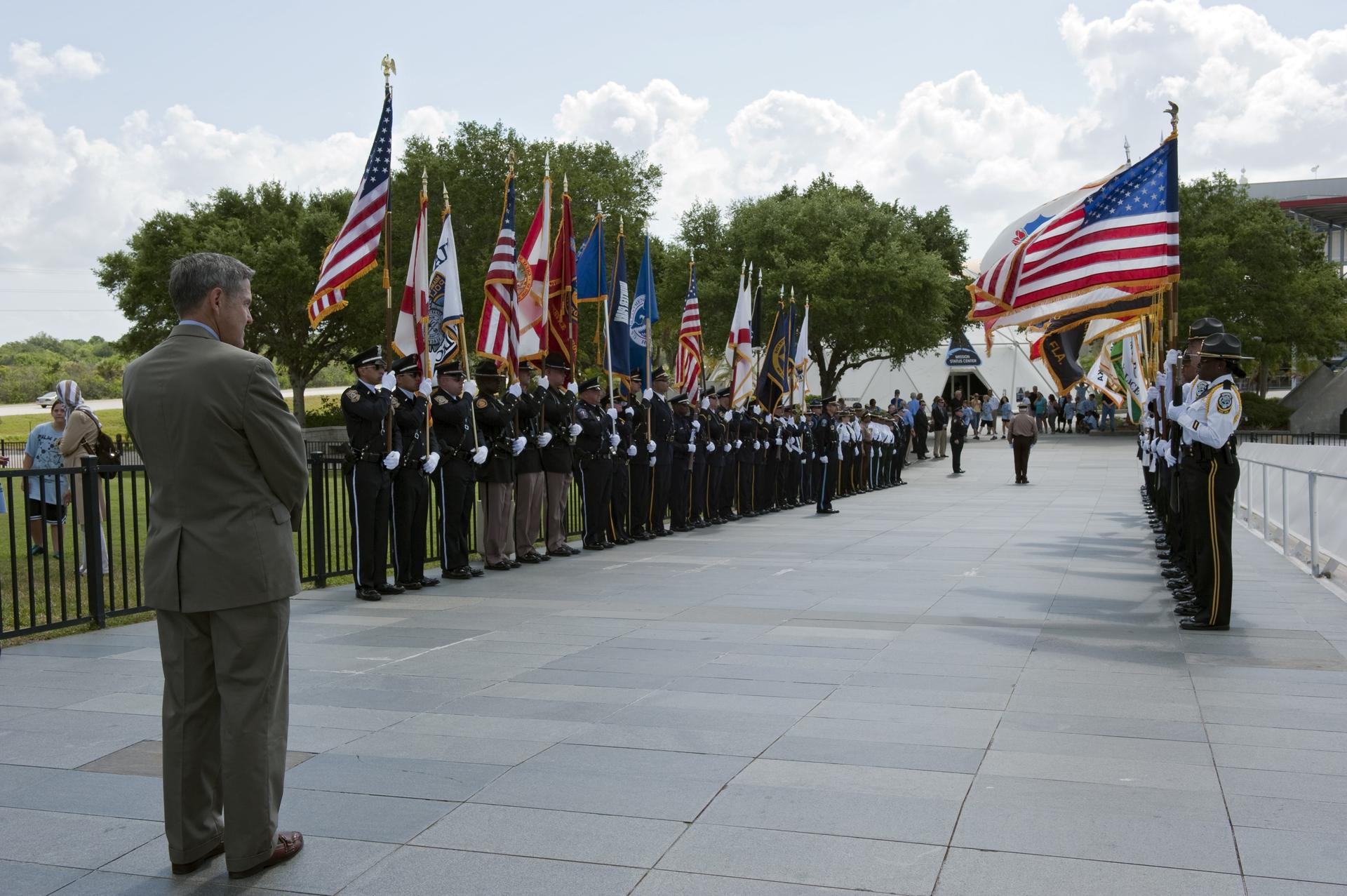 CAPE CANAVERAL, Fla. -- At NASA's Kennedy Space Center Visitor Complex, Center Director Bob Cabana stands at the base of the Astronaut Memorial Mirror awaiting the arrival of James Loftus, director of the Miami-Dade Police Department who will present to him the U.S. Honor Flag. The flag is presented to NASA to be prepared to fly aboard space shuttle Atlantis on the Space Shuttle Program's final mission, STS-135. The U.S. Honor Flag has been flown nationwide, at Ground Zero and throughout the world to honor heroes who have lost their lives while serving their community and country, including police officers, firefighters, members of the Armed Forces and astronauts. More than 100 honor guard members traveled to the Space Coast to take part in the ceremony. After the flag returns to Earth, it will continue as a traveling memorial. Photo credit: NASA/Kim Shiflett
