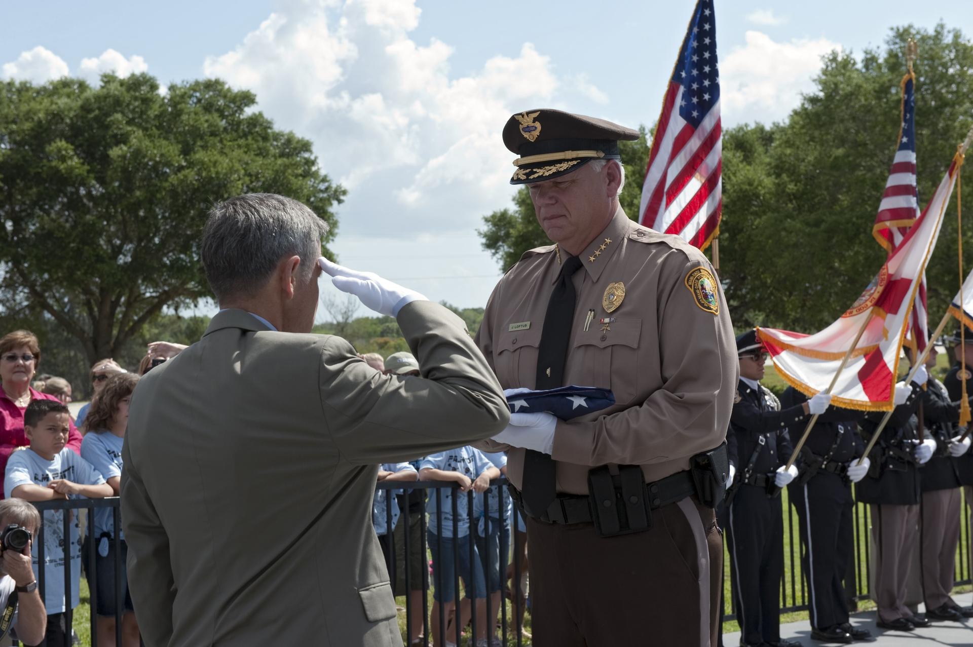 CAPE CANAVERAL, Fla. -- At the base of the Astronaut Memorial Mirror at NASA's Kennedy Space Center Visitor Complex, Center Director Bob Cabana salutes as James Loftus (right), director of the Miami-Dade Police Department presents him with the U.S. Honor Flag. The flag is presented to NASA to be prepared to fly aboard space shuttle Atlantis on the Space Shuttle Program's final mission, STS-135. The U.S. Honor Flag has been flown nationwide, at Ground Zero and throughout the world to honor heroes who have lost their lives while serving their community and country, including police officers, firefighters, members of the Armed Forces and astronauts. More than 100 honor guard members traveled to the Space Coast to take part in the ceremony. After the flag returns to Earth, it will continue as a traveling memorial. Photo credit: NASA/Kim Shiflett
