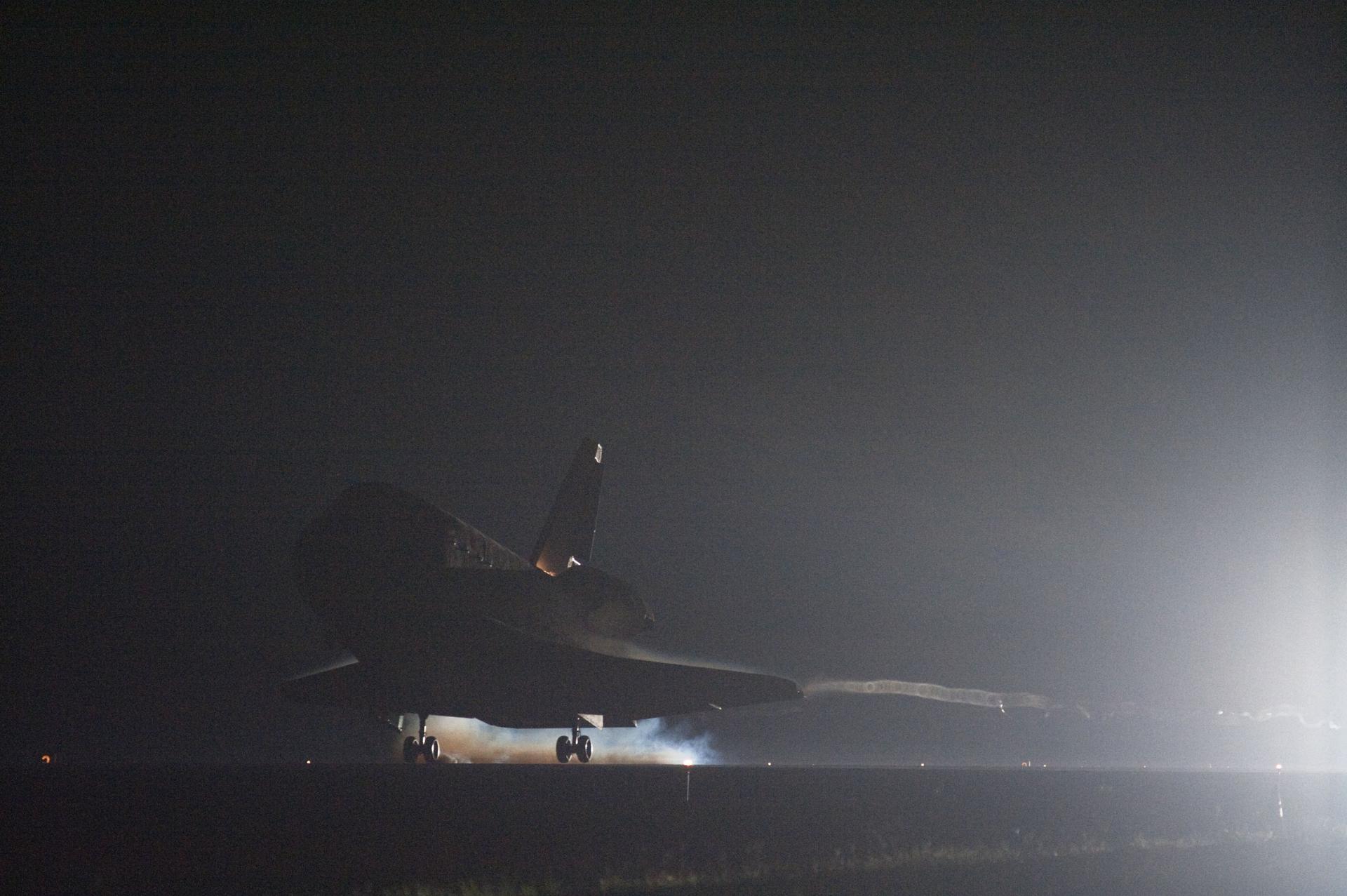 CAPE CANAVERAL, Fla. -- Streams of smoke trail from the main landing gear tires as space shuttle Endeavour touches down on the Shuttle Landing Facility's Runway 15 at NASA's Kennedy Space Center in Florida for the final time marking the 25th night landing of NASA's Space Shuttle Program. Main gear touchdown was at 2:34:51 a.m. EDT, followed by nose gear touchdown at 2:35:04 a.m., and wheelstop at 2:35:36 a.m. On board are STS-134 Commander Mark Kelly, Pilot Greg H. Johnson, and Mission Specialists Mike Fincke, Drew Feustel, Greg Chamitoff and the European Space Agency's Roberto Vittori. STS-134 delivered the Alpha Magnetic Spectrometer-2 (AMS) and the Express Logistics Carrier-3 (ELC-3) to the International Space Station. AMS will help researchers understand the origin of the universe and search for evidence of dark matter, strange matter and antimatter from the station. ELC-3 carried spare parts that will sustain station operations once the shuttles are retired from service. STS-134 was the 25th and final flight for Endeavour, which has spent 299 days in space, orbited Earth 4,671 times and traveled 122,883,151 miles. Photo credit: NASA/Sandra Joseph and Kevin O'Connell