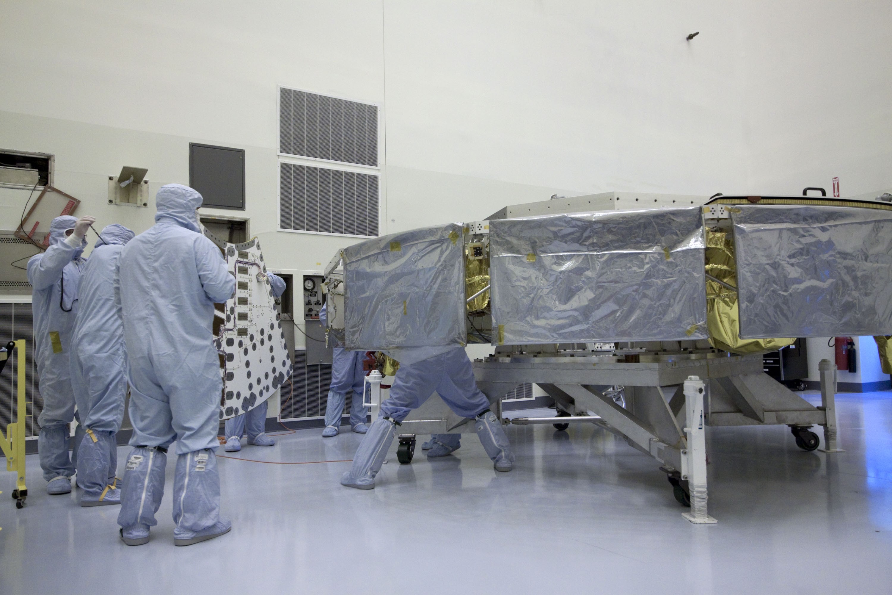 Cape Canaveral, Fla. -- At the Payload Hazardous Servicing Facility at NASA's Kennedy Space Center in Florida, technicians are installing a solar array panel to the cruise stage of NASA's Mars Science Laboratory (MSL). MSL's components include a compact car-sized rover, Curiosity, which has 10 science instruments designed to search for evidence on whether Mars has had environments favorable to microbial life, including chemical ingredients for life. The unique rover will use a laser to look inside rocks and release its gasses so that the rover’s spectrometer can analyze and send the data back to Earth. Launch of MSL aboard a United Launch Alliance Atlas V rocket is scheduled for Nov. 25 from Space Launch Complex 41 on Cape Canaveral Air Force Station in Florida. For more information, visit http://www.nasa.gov/msl. Photo credit: NASA/Jack Pfaller