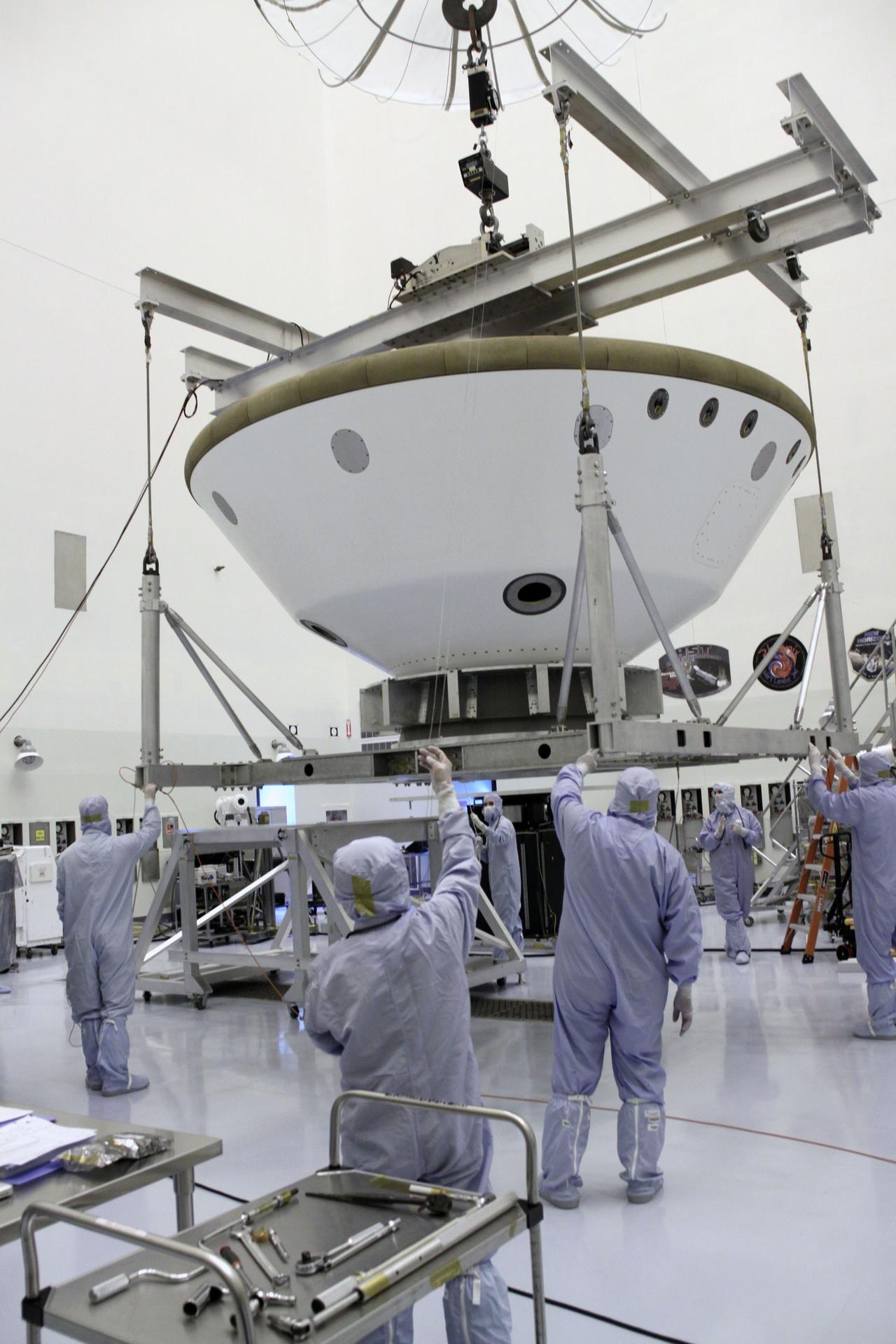 Cape Canaveral, Fla. -- At the Payload Hazardous Servicing Facility at NASA's Kennedy Space Center in Florida, technicians use an overhead crane to move the aeroshell, a component of NASA's Mars Science Laboratory (MSL), to a spin stand for testing. The aeroshell consists of the backshell which carries the parachute and several components used during later stages of entry, descent and landing, and the spacecraft's heat shield. MSL's components include a compact car-sized rover, Curiosity, which has 10 science instruments designed to search for evidence on whether Mars has had environments favorable to microbial life, including chemical ingredients for life. The unique rover will use a laser to look inside rocks and release its gasses so that the rover’s spectrometer can analyze and send the data back to Earth. Launch of MSL aboard a United Launch Alliance Atlas V rocket is scheduled for Nov. 25 from Space Launch Complex 41 on Cape Canaveral Air Force Station in Florida. For more information, visit http://www.nasa.gov/msl. Photo credit: NASA/Jack Pfaller