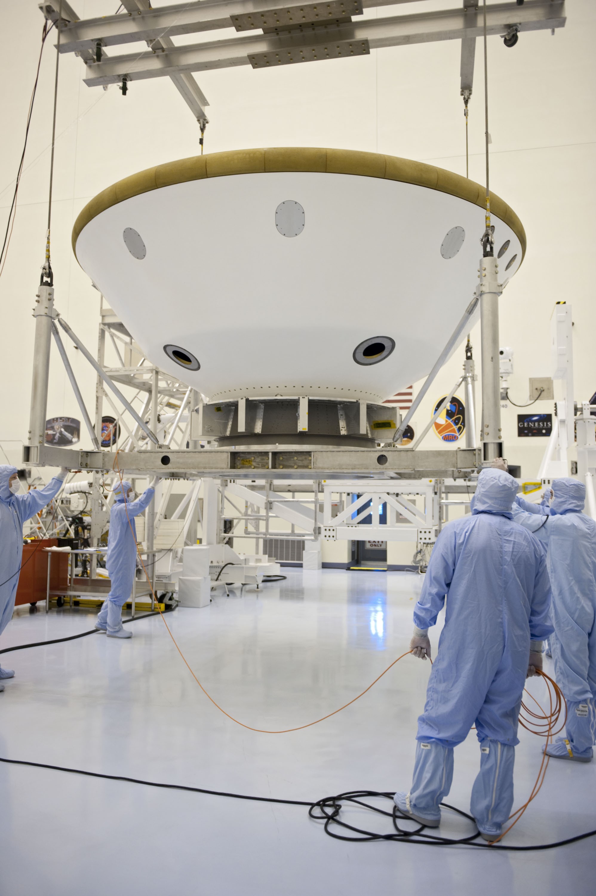 Cape Canaveral, Fla. -- At the Payload Hazardous Servicing Facility at NASA's Kennedy Space Center in Florida, technicians using an overhead crane, move the aeroshell, a component of NASA's Mars Science Laboratory (MSL), back to a work stand after a spin and balance test. The aeroshell consists of the backshell which carries the parachute and several components used during later stages of entry, descent and landing, and the spacecraft's heat shield. MSL's components include a compact car-sized rover, Curiosity, which has 10 science instruments designed to search for evidence on whether Mars has had environments favorable to microbial life, including chemical ingredients for life. The unique rover will use a laser to look inside rocks and release its gasses so that the rover’s spectrometer can analyze and send the data back to Earth. Launch of MSL aboard a United Launch Alliance Atlas V rocket is scheduled for Nov. 25 from Space Launch Complex 41 on Cape Canaveral Air Force Station in Florida. For more information, visit http://www.nasa.gov/msl. Photo credit: NASA/Kim Shiflett