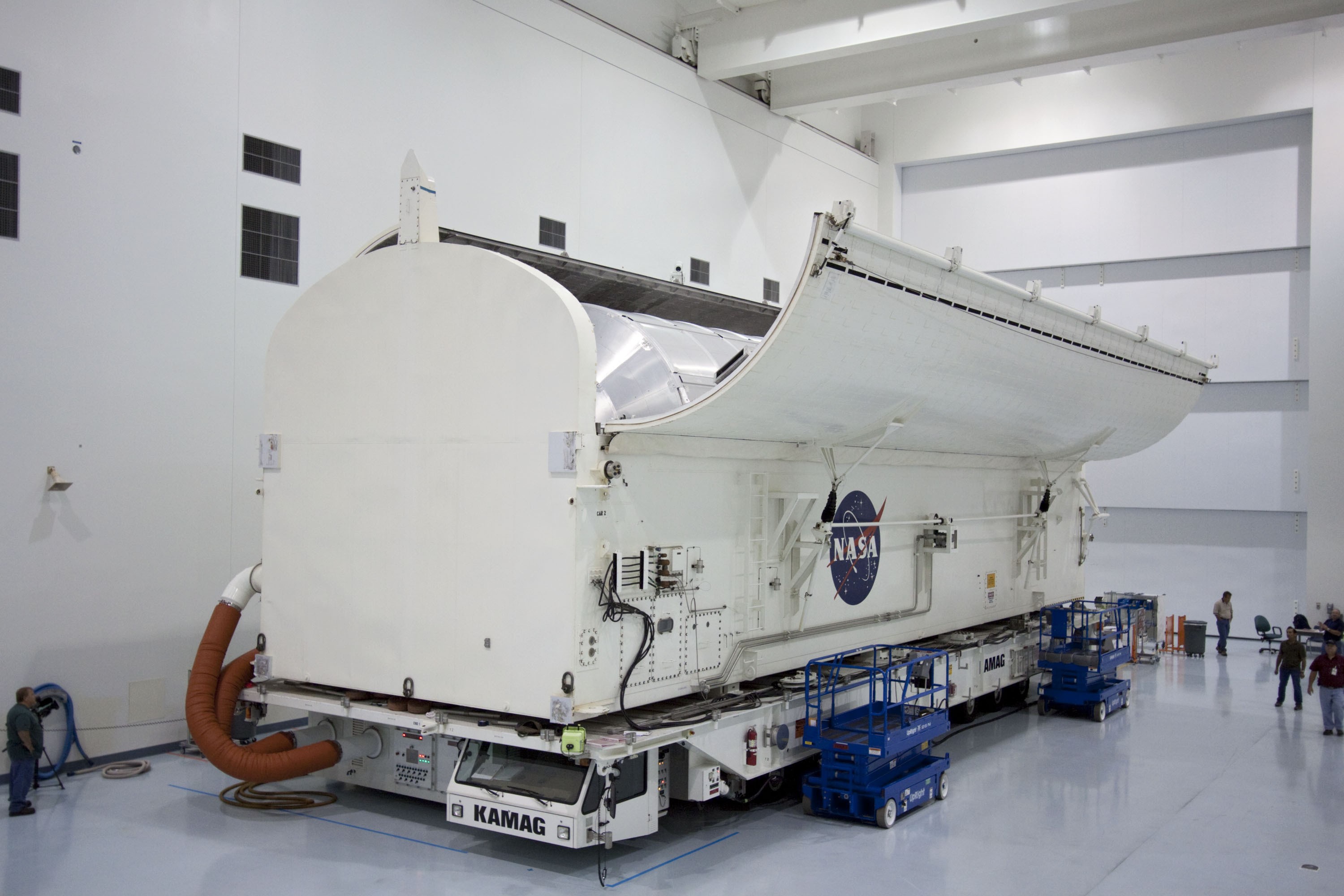 CAPE CANAVERAL, Fla. -- In the Space Station Processing Facility at NASA's Kennedy Space Center in Florida, the clamshell doors on the canister atop its transporter close around the Raffaello multi-purpose logistics module, or MPLM, secured inside. Commander Chris Ferguson, Pilot Doug Hurley and Mission Specialists Sandra Magnus and Rex Walheim are targeted to lift off on space shuttle Atlantis July 8, taking with them the MPLM packed with supplies, logistics and spare parts to the International Space Station. The STS-135 mission also will fly a system to investigate the potential for robotically refueling existing spacecraft and return a failed ammonia pump module to help NASA better understand the failure mechanism and improve pump designs for future systems. STS-135 will be the 33rd flight of Atlantis, the 37th shuttle mission to the space station, and the 135th and final mission of NASA's Space Shuttle Program. For more information, visit www.nasa.gov/mission_pages/shuttle/shuttlemissions/sts135/index.html. Photo credit: NASA/Jim Grossmann