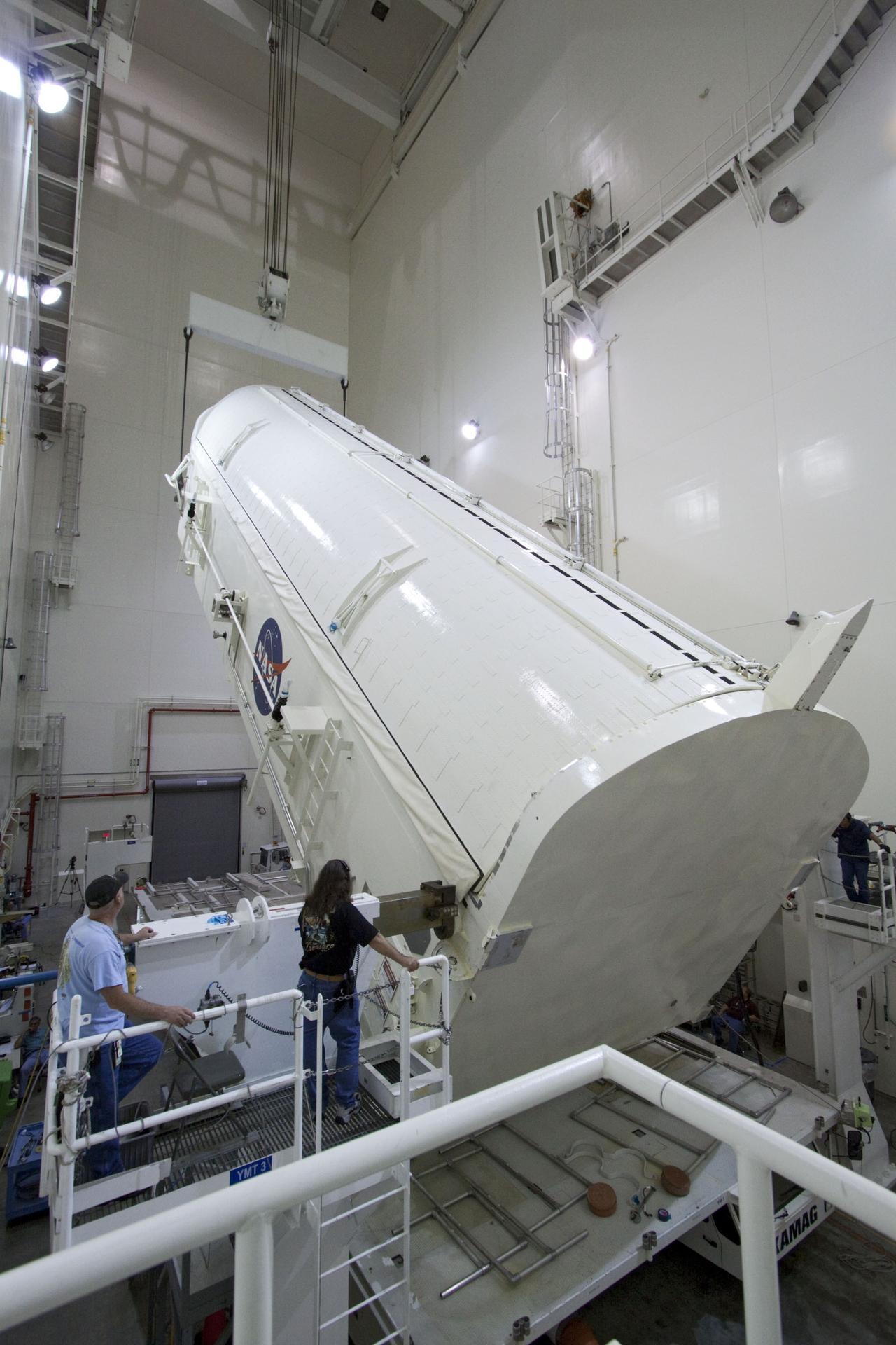 CAPE CANAVERAL, Fla. -- Workers monitor the progress of a canister, carrying the Raffaello multi-purpose logistics module, or MPLM, for the STS-135 mission, as it is rotated from a horizontal to vertical position in the Canister Rotation Facility at NASA's Kennedy Space Center in Florida. Commander Chris Ferguson, Pilot Doug Hurley and Mission Specialists Sandra Magnus and Rex Walheim are targeted to lift off on space shuttle Atlantis July 8, taking with them the MPLM packed with supplies, logistics and spare parts to the International Space Station. The STS-135 mission also will fly a system to investigate the potential for robotically refueling existing spacecraft and return a failed ammonia pump module to help NASA better understand the failure mechanism and improve pump designs for future systems. STS-135 will be the 33rd flight of Atlantis, the 37th shuttle mission to the space station, and the 135th and final mission of NASA's Space Shuttle Program. For more information, visit www.nasa.gov/mission_pages/shuttle/shuttlemissions/sts135/index.html. Photo credit: NASA/Jack Pfaller