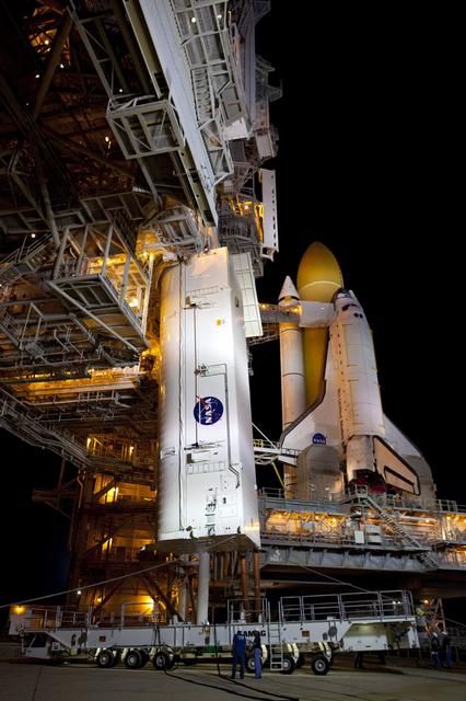 CAPE CANAVERAL, Fla. -- The payload canister carrying the Raffaello multi-purpose logistics module (MPLM) is lifted to the payload changeout room on the rotating service structure (RSS) on Launch Pad 39A at NASA's Kennedy Space Center in Florida. Umbilical hoses, maintaining a controlled environment for the cargo are attached to the lower end of the canister. The payload ground-handling mechanism then will be used to transfer Raffaello out of the canister into Atlantis' payload bay. Next, the RSS that protects the shuttle from the elements and provides access will be rotated back into place. Commander Chris Ferguson, Pilot Doug Hurley and Mission Specialists Sandra Magnus and Rex Walheim are targeted to lift off on Atlantis July 8, taking with them the MPLM packed with supplies, logistics and spare parts to the station. The STS-135 mission also will fly a system to investigate the potential for robotically refueling existing satellites and return a failed ammonia pump module to help NASA better understand the failure mechanism and improve pump designs for future systems. STS-135 will be the 33rd flight of Atlantis, the 37th shuttle mission to the space station, and the 135th and final mission of NASA's Space Shuttle Program. For more information visit, www.nasa.gov/mission_pages/shuttle/shuttlemissions/sts135/index.html. Photo credit: NASA/Dimitri Gerondidakis