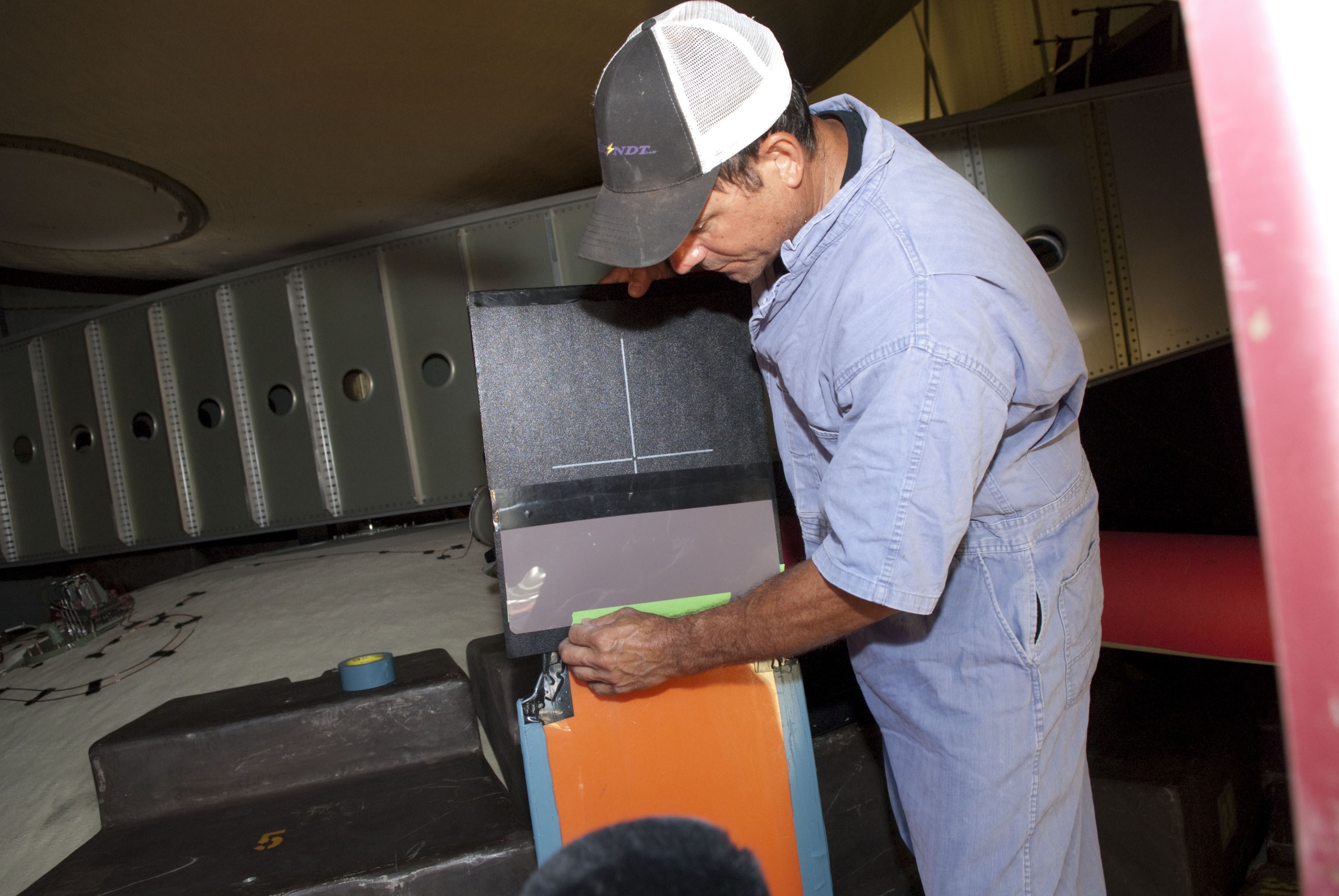 CAPE CANAVERAL, Fla. -- At NASA's Kennedy Space Center in Florida, technicians prepare to conduct Computed Radiography (CR) X-ray scans of 50 support beams, called stringers, on the shuttle-facing side of Atlantis' external tank at Launch Pad 39A. The hi-tech images will be taken of the tops and bottoms of the 21-foot long beams, which are located on the tank's intertank section. Here, a technician prepares an image plate inside the outertank. The scans follow a June 15th tanking test when the launch team filled then drained the tank of about 535,000 gallons of liquid hydrogen and liquid oxygen, just like for a launch. Earlier this year, managers directed teams to make the same stringer modifications to Atlantis' tank, ET-138, as they had after small cracks in the support beams of shuttle Discovery's STS-133 mission external tank were discovered. The scans will confirm there are no issues with Atlantis' tank. STS-135 Commander Chris Ferguson, Pilot Doug Hurley and Mission Specialists Sandy Magnus and Rex Walheim are targeted to lift off on space shuttle Atlantis July 8, taking with them the MPLM packed with supplies, logistics and spare parts to the International Space Station. The STS-135 mission also will fly a system to investigate the potential for robotically refueling existing satellites and return a failed ammonia pump module to help NASA better understand the failure mechanism and improve pump designs for future systems. STS-135 will be the 33rd flight of Atlantis, the 37th shuttle mission to the space station, and the 135th and final mission of NASA's Space Shuttle Program. For more information visit, www.nasa.gov/mission_pages/shuttle/shuttlemissions/sts135/index.html. Photo credit: NASA/Jim Grossmann