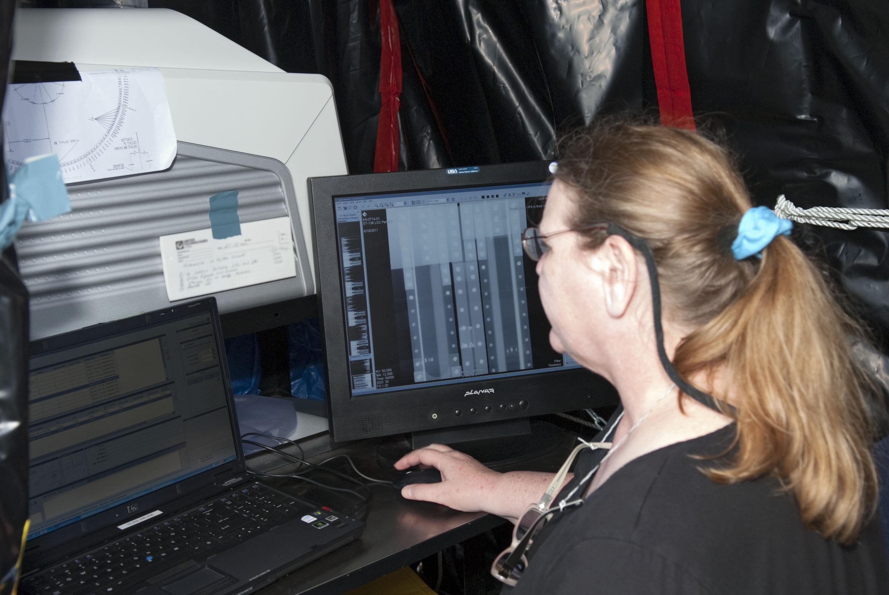 CAPE CANAVERAL, Fla. -- At NASA's Kennedy Space Center in Florida, technicians conduct Computed Radiography (CR) X-ray scans of 50 support beams, called stringers, on the shuttle-facing side of Atlantis' external tank at Launch Pad 39A. The hi-tech images will be taken of the tops and bottoms of the 21-foot long beams, which are located on the tank's intertank section. The scans follow a June 15th tanking test when the launch team filled then drained the tank of about 535,000 gallons of liquid hydrogen and liquid oxygen, just like for a launch. Earlier this year, managers directed teams to make the same stringer modifications to Atlantis' tank, ET-138, as they had after small cracks in the support beams of shuttle Discovery's STS-133 mission external tank were discovered. The scans will confirm there are no issues with Atlantis' tank. STS-135 Commander Chris Ferguson, Pilot Doug Hurley and Mission Specialists Sandy Magnus and Rex Walheim are targeted to lift off on space shuttle Atlantis July 8, taking with them the MPLM packed with supplies, logistics and spare parts to the International Space Station. The STS-135 mission also will fly a system to investigate the potential for robotically refueling existing satellites and return a failed ammonia pump module to help NASA better understand the failure mechanism and improve pump designs for future systems. STS-135 will be the 33rd flight of Atlantis, the 37th shuttle mission to the space station, and the 135th and final mission of NASA's Space Shuttle Program. For more information visit, www.nasa.gov/mission_pages/shuttle/shuttlemissions/sts135/index.html. Photo credit: NASA/Jim Grossmann