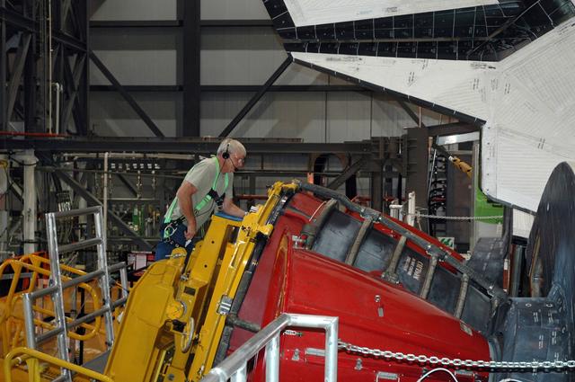 CAPE CANAVERAL, Fla. -- In Orbiter Processing Facility-1 at NASA's Kennedy Space Center in Florida, technicians remove engine No. 1, one of three space shuttle main engines from shuttle Endeavour using a specially designed engine installer, called a Hyster forklift. The work is part of Endeavour's transition and retirement processing. The spacecraft is being prepared for public display at the California Science Center in Los Angeles. Endeavour flew 25 missions, spent 299 days in space, orbited Earth 4,671 times and traveled 122,883,151 miles over the course of its 19-year career. Endeavour's STS-134 and final mission was completed after landing on June 1, 2011. Photo credit: NASA/Chris Chamberland