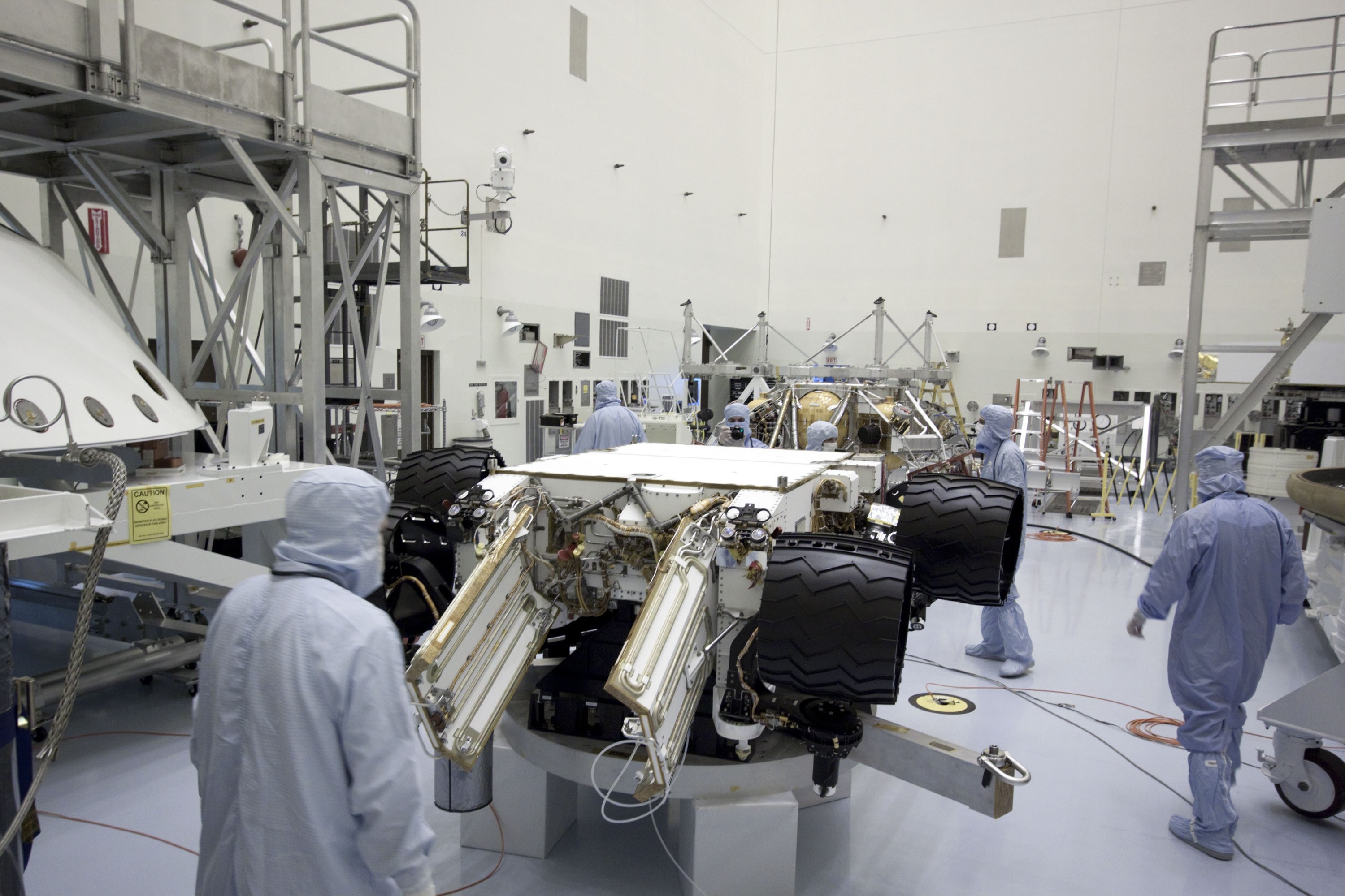 Cape Canaveral, Fla. -- At the Payload Hazardous Servicing Facility at NASA's Kennedy Space Center in Florida, NASA's Mars Science Laboratory (MSL) rover known as Curiosity, is secured on a work stand for processing. The spacecraft's backshell (left), which carries the parachute and several components used during later stages of entry, descent and landing, in addition is the rocket-powered descent stage (background), also is visible in the image. A United Launch Alliance Atlas V-541 configuration will be used to loft MSL into space. Curiosity’s 10 science instruments are designed to search for evidence on whether Mars has had environments favorable to microbial life, including chemical ingredients for life. The unique rover will use a laser to look inside rocks and release its gasses so that the rover’s spectrometer can analyze and send the data back to Earth. MSL is scheduled to launch from Cape Canaveral Air Force Station in Florida Nov. 25 with a window extending to Dec. 18 and arrival at Mars Aug. 2012. For more information, visit http://www.nasa.gov/msl. Photo credit: NASA/Jim Grossmann