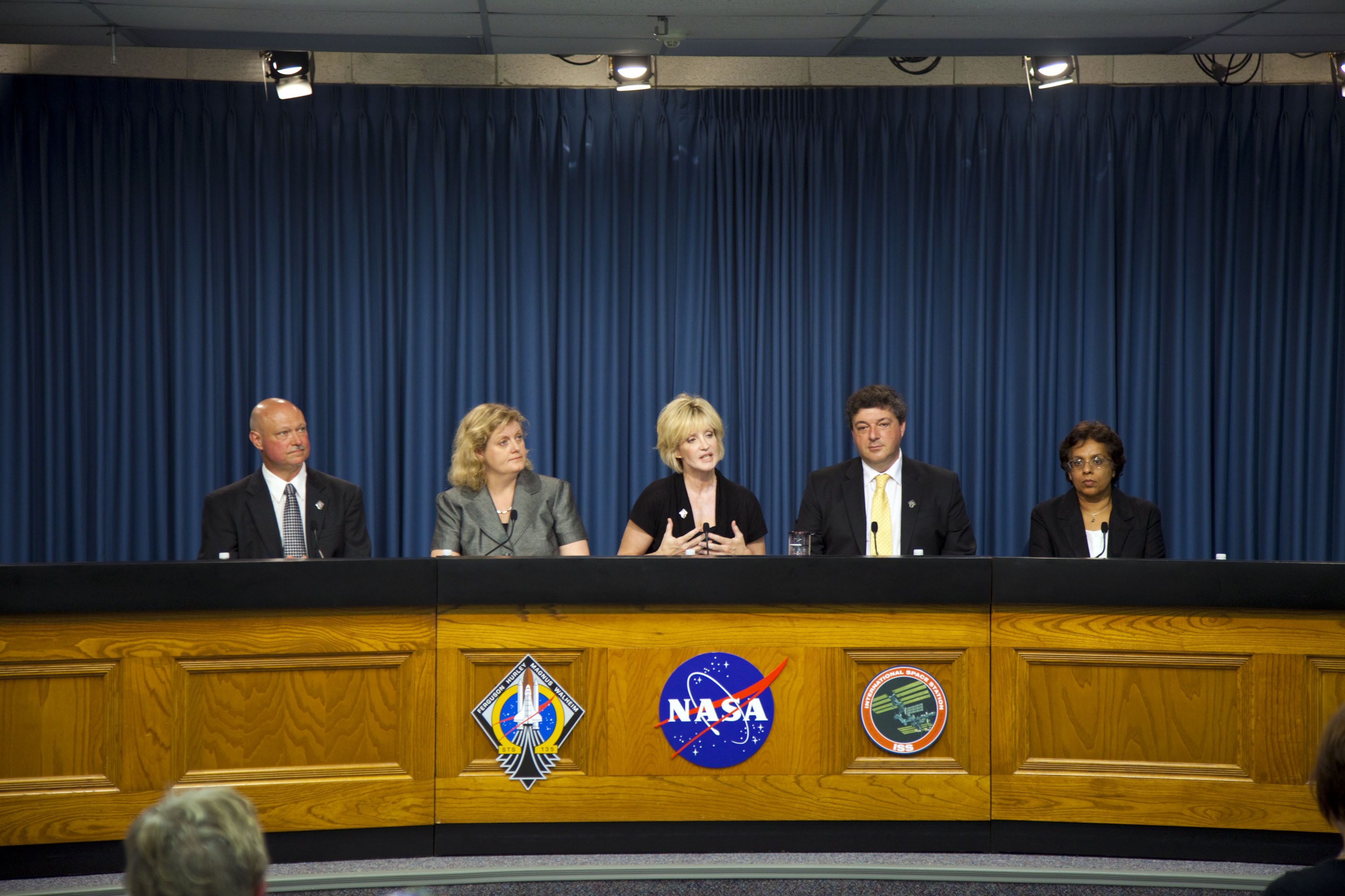 CAPE CANAVERAL, Fla. -- The Press Site auditorium at NASA's Kennedy Space Center in Florida hosted an International Space Station Science and Technology news conference. Seen here are NASA Public Affairs Officer Make Curie, moderator (left); Julie Robinson, International Space Station Program scientist; Cheryl Nickerson, Recombinant Attenuated Salmonella Vaccine investigator; Eduardo Almeda, investigator and Imara Perera, Plant Signaling investigator Photo credit: NASA/Frankie Martin