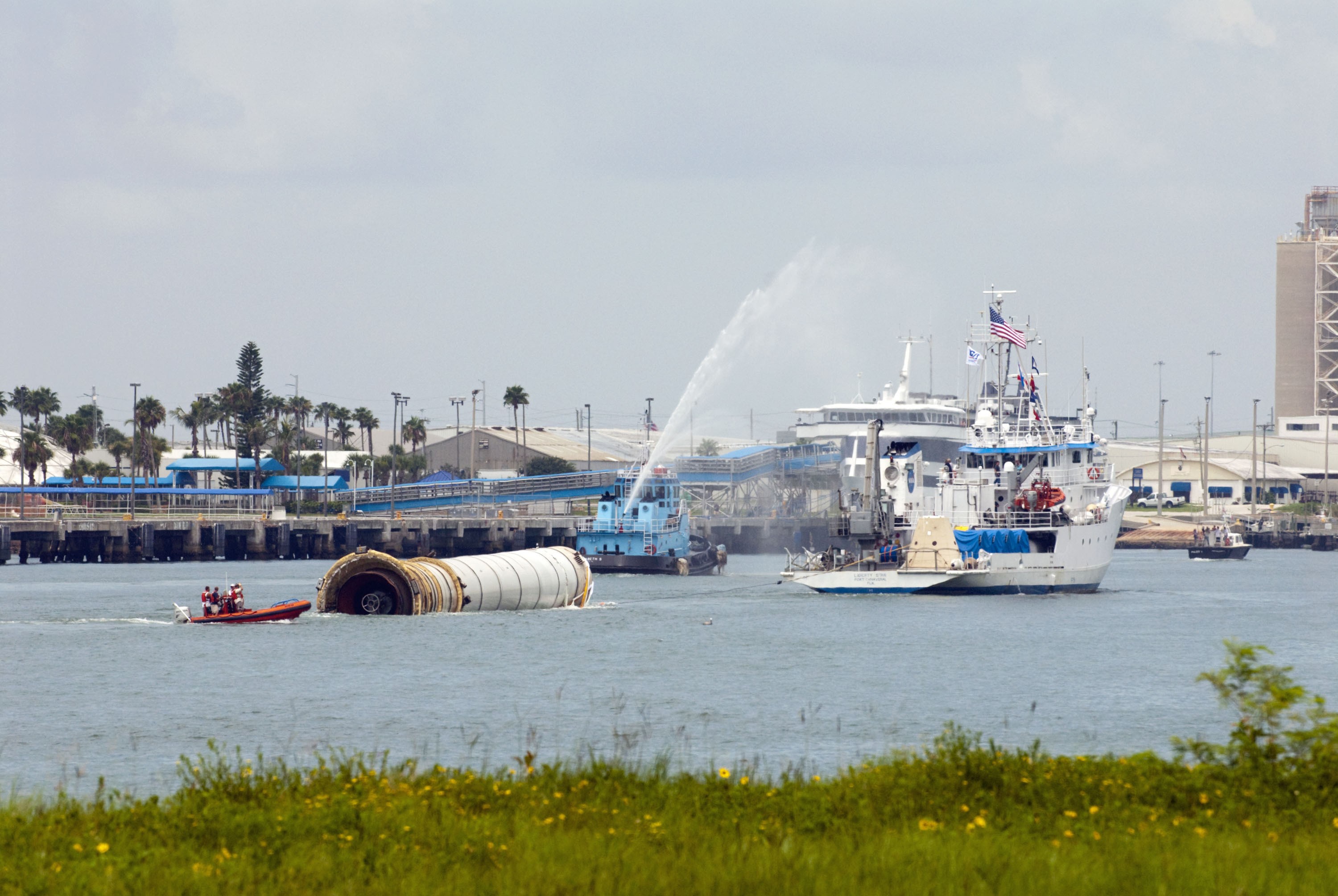 CAPE CANAVERAL, Fla. – A water-spraying tugboat escorts the Liberty Star as it tows the right spent booster from space shuttle Atlantis' final to Port Canaveral in Florida. The Liberty Star is one of NASA's solid rocket booster retrieval ships. The shuttle's two solid rocket booster casings and associated flight hardware are recovered in the Atlantic Ocean after every launch by Freedom Star and Liberty Star. The boosters impact the Atlantic about seven minutes after liftoff and the retrieval ships are stationed about 10 miles from the impact area at the time of splashdown. After the spent segments are processed, they will be transported to Utah, where they will be deserviced and stored, if needed. Atlantis began its final flight at 11:29 a.m. EDT on July 8 to deliver the Raffaello multi-purpose logistics module packed with supplies and spare parts for the International Space Station. Atlantis also delivers the Robotic Refueling Mission experiment that will investigate the potential for robotically refueling existing satellites in orbit to the station. In addition, Atlantis will return with a failed ammonia pump module to help NASA better understand the failure mechanism and improve pump designs for future systems. STS-135 is the 33rd flight of Atlantis, the 37th shuttle mission to the space station, and the 135th and final mission of NASA's Space Shuttle Program. For more information, visit www.nasa.gov/mission_pages/shuttle/shuttlemissions/sts135/index.html. Photo credit: NASA/Kim Shiflett