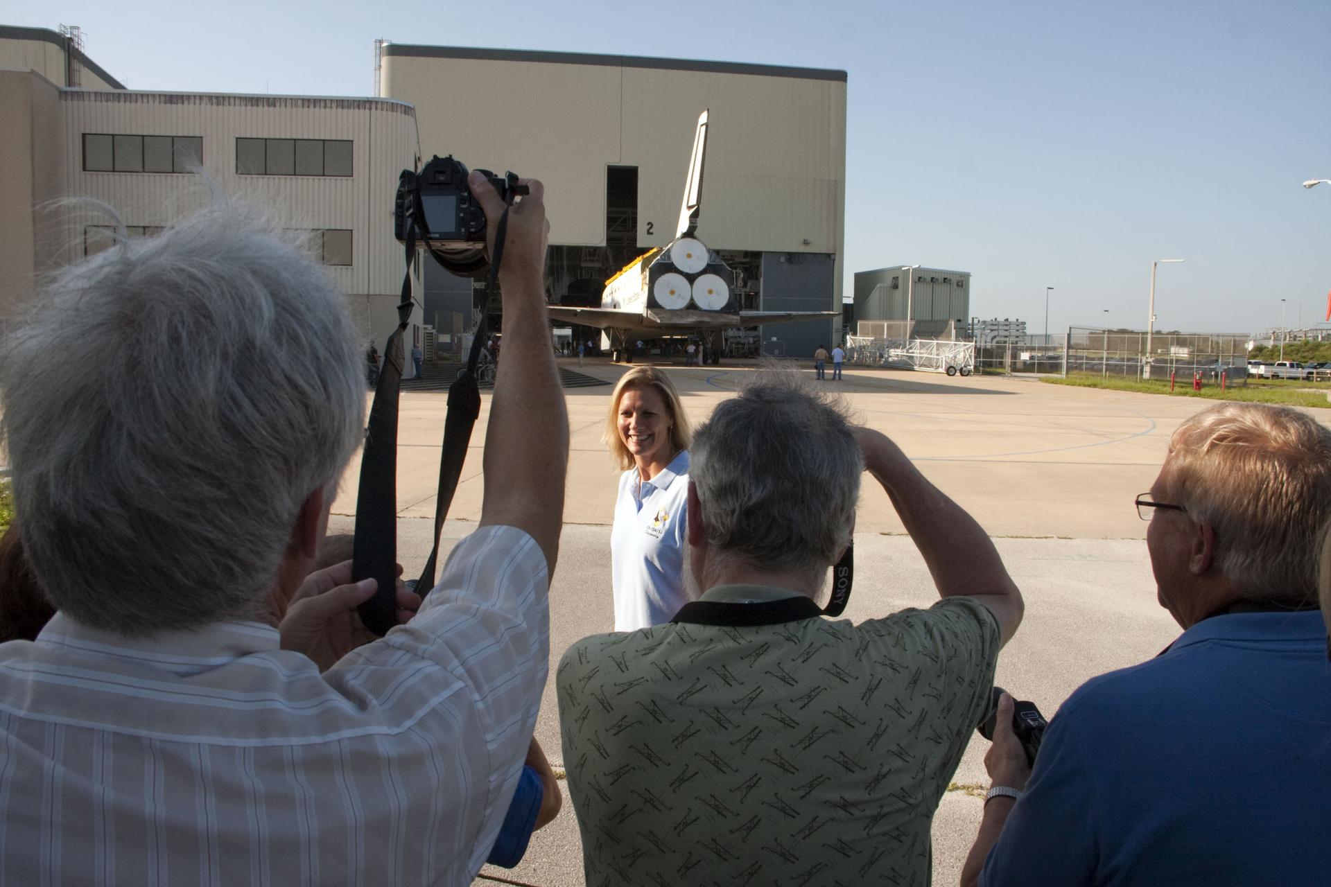 CAPE CANAVERAL, Fla. -- Outside Orbiter Processing Facility-2, or OPF-2, at NASA's Kennedy Space Center in Florida, media on hand to cover the move of space shuttle Discovery to the Vehicle Assembly Building, or VAB, are given the opportunity to interview Stephanie Stilson, Transition and Retirement orbiter flow director. Discovery will be stored inside the VAB for approximately one month while shuttle Atlantis undergoes processing in OPF-2 following its final mission, STS-135. Discovery flew its 39th and final mission, STS-133, in February and March 2011, and currently is being prepared for public display at the Smithsonian's National Air and Space Museum Steven F. Udvar-Hazy Center in Virginia. For more information about Discovery's Transition and Retirement, visit www.nasa.gov/mission_pages/shuttle/launch/discovery_rss_collection_archive_1.html. Photo credit: NASA/Ken Thornsley