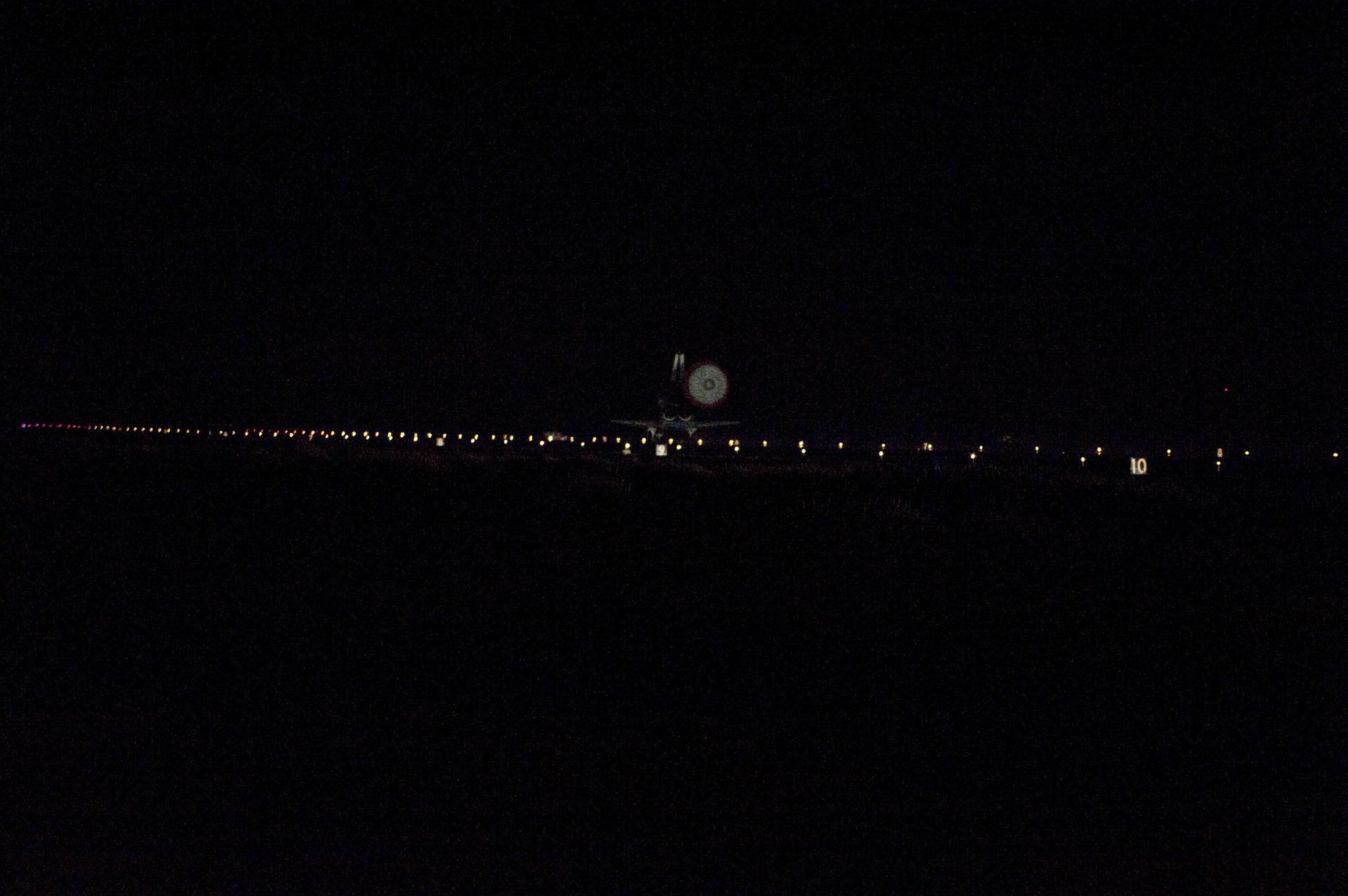 CAPE CANAVERAL, Fla. -- Space shuttle Atlantis' drag chute is illuminated as the spacecraft glides to a stop on Runway 15 at NASA's Kennedy Space Center in Florida for the last time. Securing the space shuttle fleet's place in history, Atlantis marked the 26th nighttime landing of NASA's Space Shuttle Program and the 78th landing at Kennedy. Main gear touchdown was at 5:57:00 a.m. EDT, followed by nose gear touchdown at 5:57:20 a.m., and wheelstop at 5:57:54 a.m. On board are STS-135 Commander Chris Ferguson, Pilot Doug Hurley, and Mission Specialists Sandra Magnus and Rex Walheim. CAPE CANAVERAL, Fla. -- Xenons cast a halo of light on space shuttle Atlantis as the spacecraft approaches Runway 15 at NASA's Kennedy Space Center in Florida for the last time. Securing the space shuttle fleet's place in history, Atlantis marked the 26th nighttime landing of NASA's Space Shuttle Program and the 78th landing at Kennedy. Main gear touchdown was at 5:57:00 a.m. EDT, followed by nose gear touchdown at 5:57:20 a.m., and wheelstop at 5:57:54 a.m. On board are STS-135 Commander Chris Ferguson, Pilot Doug Hurley, and Mission Specialists Sandra Magnus and Rex Walheim. On the 37th shuttle mission to the International Space Station, STS-135 delivered more than 9,400 pounds of spare parts, equipment and supplies in the Raffaello multi-purpose logistics module that will sustain station operations for the next year. STS-135 was the 33rd and final flight for Atlantis, which has spent 307 days in space, orbited Earth 4,848 times and traveled 125,935,769 miles. For more information visit, www.nasa.gov/mission_pages/shuttle/shuttlemissions/sts135/index.html. Photo credit: NASA/Carl Winebarger