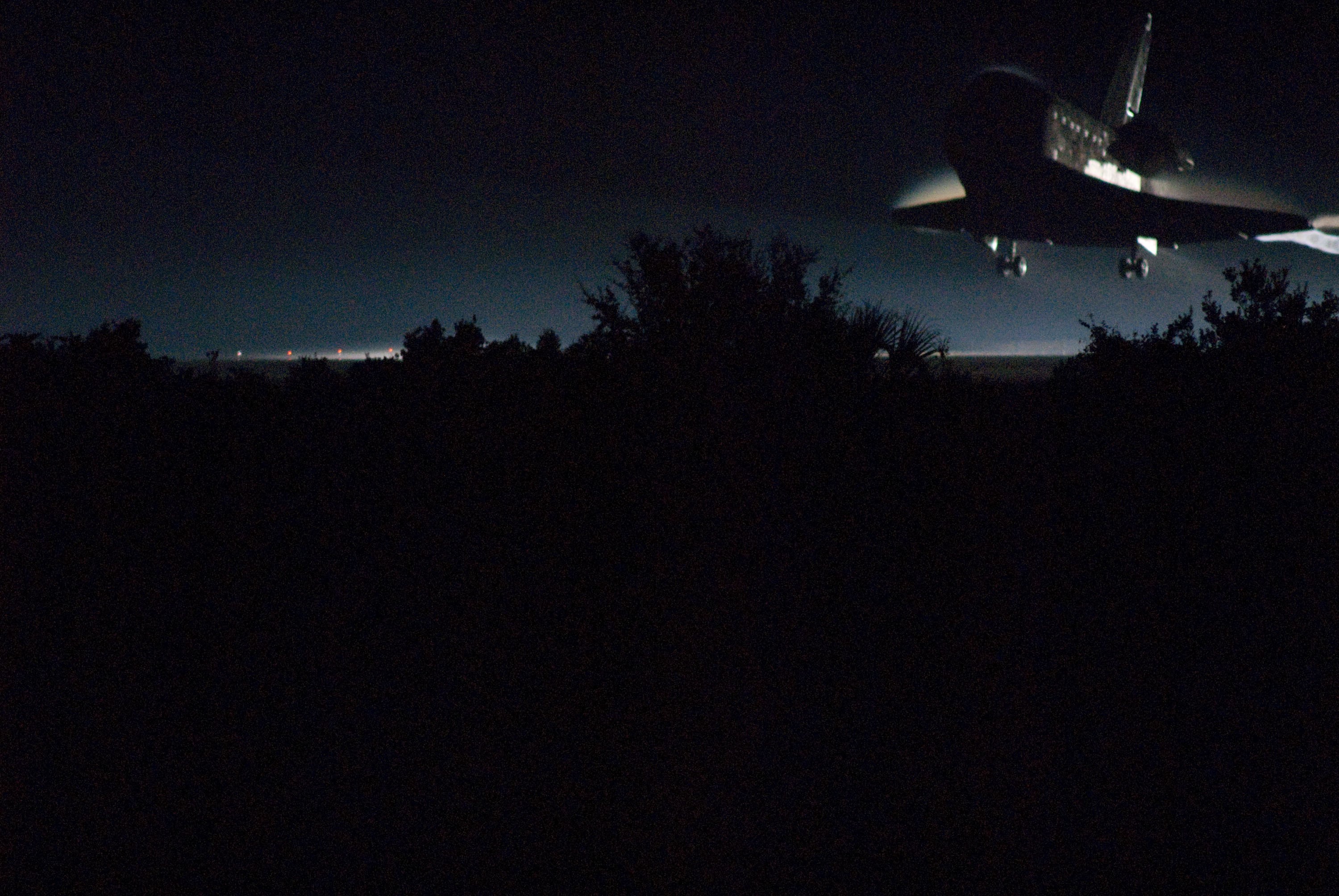 CAPE CANAVERAL, Fla. -- In darkness, space shuttle Atlantis nears touchdown for the final time on Runway 15 at the Shuttle Landing Facility at NASA's Kennedy Space Center in Florida. Securing the space shuttle fleet's place in history, Atlantis marked the 26th nighttime landing of NASA's Space Shuttle Program and the 78th landing at Kennedy. Main gear touchdown was at 5:57:00 a.m. EDT, followed by nose gear touchdown at 5:57:20 a.m., and wheelstop at 5:57:54 a.m. On board are STS-135 Commander Chris Ferguson, Pilot Doug Hurley, and Mission Specialists Sandra Magnus and Rex Walheim. On the 37th shuttle mission to the International Space Station, STS-135 delivered in the Raffaello multi-purpose logistics module more than 9,400 pounds of spare parts, equipment and supplies that will sustain station operations for the next year. STS-135 was the 33rd and final flight for Atlantis, which has spent 307 days in space, orbited Earth 4,848 times and traveled 125,935,769 miles. STS-135 is the final mission in the Space Shuttle Program. For more information, visit www.nasa.gov/mission_pages/shuttle/shuttlemissions/sts135/index.html. Photo credit: NASA/Rick Wetherington