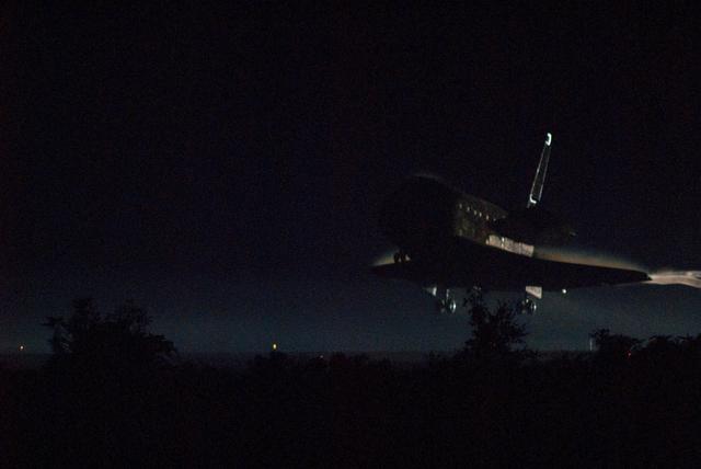 CAPE CANAVERAL, Fla. -- Enshrouded in darkness, space shuttle Atlantis nears touchdown for the final time on Runway 15 at the Shuttle Landing Facility at NASA's Kennedy Space Center in Florida. Securing the space shuttle fleet's place in history, Atlantis marked the 26th nighttime landing of NASA's Space Shuttle Program and the 78th landing at Kennedy. Main gear touchdown was at 5:57:00 a.m. EDT, followed by nose gear touchdown at 5:57:20 a.m., and wheelstop at 5:57:54 a.m. On board are STS-135 Commander Chris Ferguson, Pilot Doug Hurley, and Mission Specialists Sandra Magnus and Rex Walheim. On the 37th shuttle mission to the International Space Station, STS-135 delivered in the Raffaello multi-purpose logistics module more than 9,400 pounds of spare parts, equipment and supplies that will sustain station operations for the next year. STS-135 was the 33rd and final flight for Atlantis, which has spent 307 days in space, orbited Earth 4,848 times and traveled 125,935,769 miles. STS-135 is the final mission in the Space Shuttle Program. For more information, visit www.nasa.gov/mission_pages/shuttle/shuttlemissions/sts135/index.html. Photo credit: NASA/Rick Wetherington