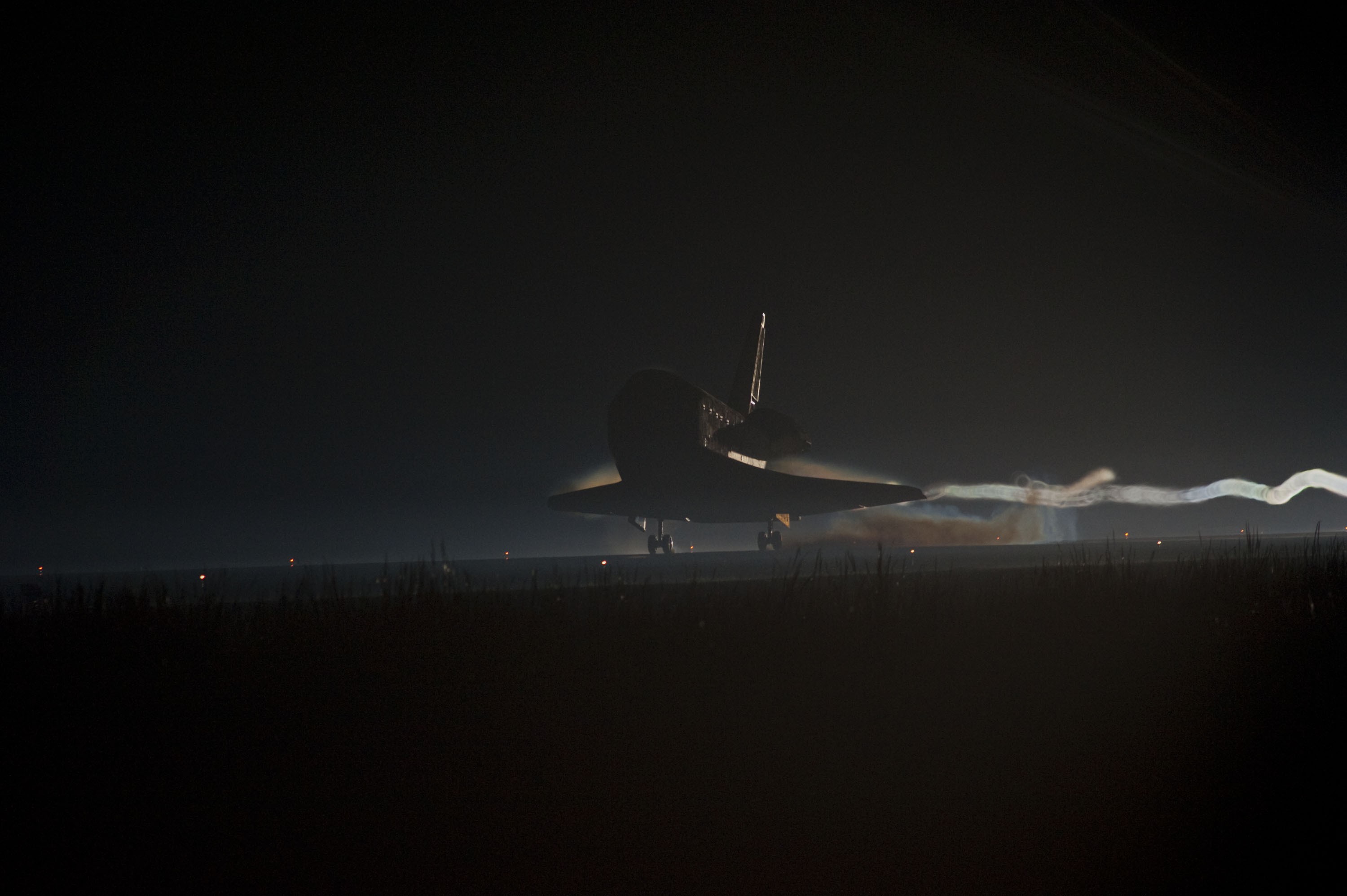 CAPE CANAVERAL, Fla. -- Ribbons of steam and smoke trail space shuttle Atlantis as it touches down for the final time on the Shuttle Landing Facility's Runway 15 at NASA's Kennedy Space Center in Florida. Securing the space shuttle fleet's place in history, Atlantis marked the 26th nighttime landing of NASA's Space Shuttle Program and the 78th landing at Kennedy. Main gear touchdown was at 5:57:00 a.m. EDT, followed by nose gear touchdown at 5:57:20 a.m., and wheelstop at 5:57:54 a.m. On board are STS-135 Commander Chris Ferguson, Pilot Doug Hurley, and Mission Specialists Sandra Magnus and Rex Walheim. On the 37th shuttle mission to the International Space Station, STS-135 delivered the Raffaello multi-purpose logistics module filled with more than 9,400 pounds of spare parts, equipment and supplies that will sustain station operations for the next year. STS-135 was the 33rd and final flight for Atlantis, which has spent 307 days in space, orbited Earth 4,848 times and traveled 125,935,769 miles. STS-135 also was the final mission of the Space Shuttle Program. For more information, visit www.nasa.gov/mission_pages/shuttle/shuttlemissions/sts135/index.html. Photo credit: NASA/Chad Baumer