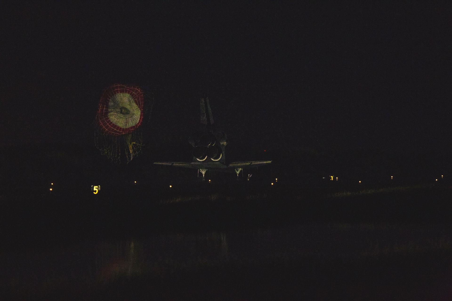 CAPE CANAVERAL, Fla. -- At the Shuttle Landing Facility at NASA's Kennedy Space Center in Florida, the drag chute trailing space shuttle Atlantis is ejected as the shuttle rolls to a stop on Runway 15 one final time. Securing the space shuttle fleet's place in history, Atlantis marked the 26th nighttime landing of NASA's Space Shuttle Program and the 78th landing at Kennedy. Main gear touchdown was at 5:57:00 a.m. EDT, followed by nose gear touchdown at 5:57:20 a.m., and wheelstop at 5:57:54 a.m. On board are STS-135 Commander Chris Ferguson, Pilot Doug Hurley, and Mission Specialists Sandra Magnus and Rex Walheim. On the 37th shuttle mission to the International Space Station, STS-135 delivered the Raffaello multi-purpose logistics module filled with more than 9,400 pounds of spare parts, equipment and supplies that will sustain station operations for the next year. STS-135 was the 33rd and final flight for Atlantis, which has spent 307 days in space, orbited Earth 4,848 times and traveled 125,935,769 miles. STS-135 also was the final mission of the Space Shuttle Program. For more information, visit www.nasa.gov/mission_pages/shuttle/shuttlemissions/sts135/index.html. Photo credit: NASA/Kenny Allen