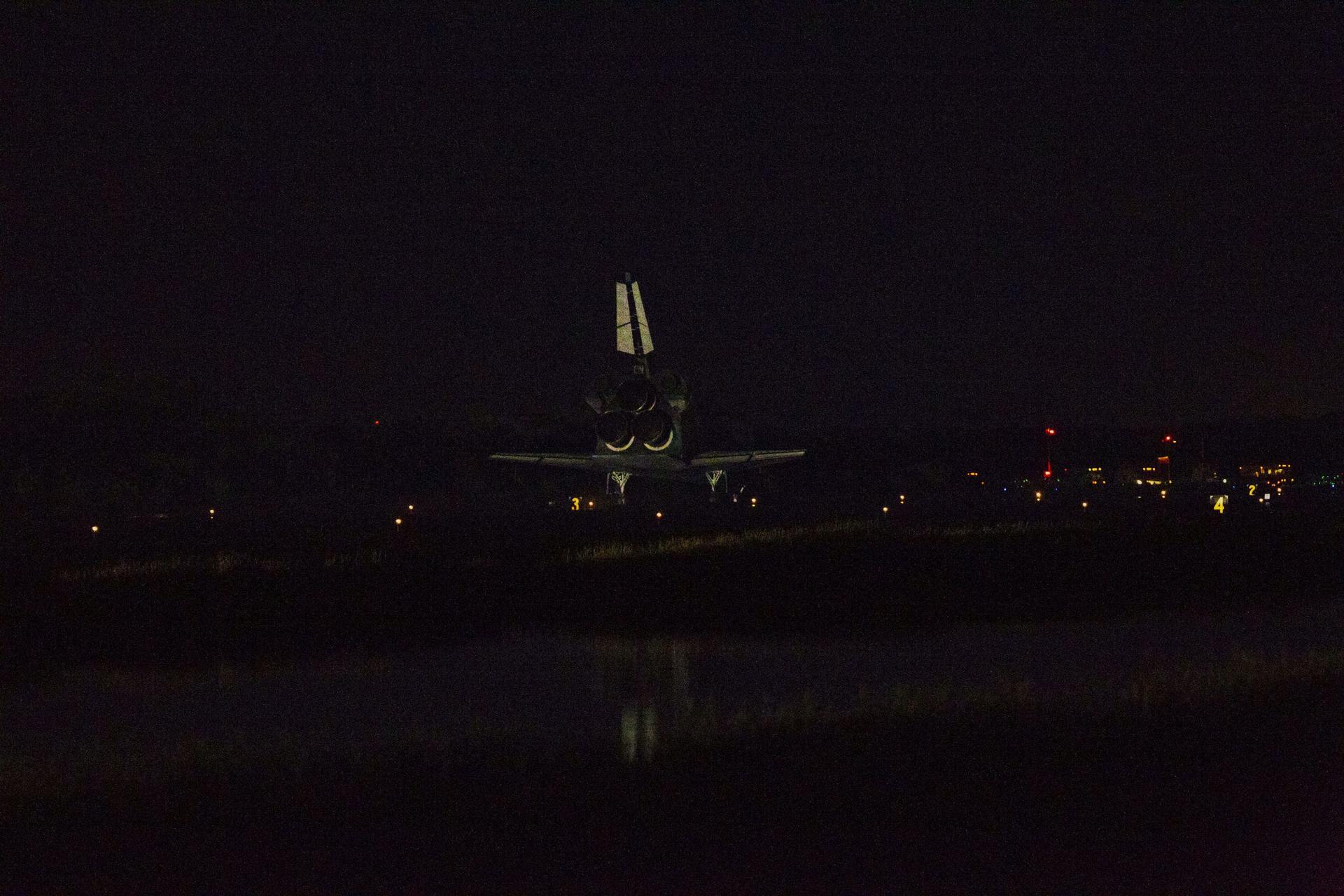 CAPE CANAVERAL, Fla. -- At the Shuttle Landing Facility at NASA's Kennedy Space Center in Florida, space shuttle Atlantis rolls to a stop on Runway 15 one final time. Securing the space shuttle fleet's place in history, Atlantis marked the 26th nighttime landing of NASA's Space Shuttle Program and the 78th landing at Kennedy. Main gear touchdown was at 5:57:00 a.m. EDT, followed by nose gear touchdown at 5:57:20 a.m., and wheelstop at 5:57:54 a.m. On board are STS-135 Commander Chris Ferguson, Pilot Doug Hurley, and Mission Specialists Sandra Magnus and Rex Walheim. On the 37th shuttle mission to the International Space Station, STS-135 delivered the Raffaello multi-purpose logistics module filled with more than 9,400 pounds of spare parts, equipment and supplies that will sustain station operations for the next year. STS-135 was the 33rd and final flight for Atlantis, which has spent 307 days in space, orbited Earth 4,848 times and traveled 125,935,769 miles. STS-135 also was the final mission of the Space Shuttle Program. For more information, visit www.nasa.gov/mission_pages/shuttle/shuttlemissions/sts135/index.html. Photo credit: NASA/Kenny Allen