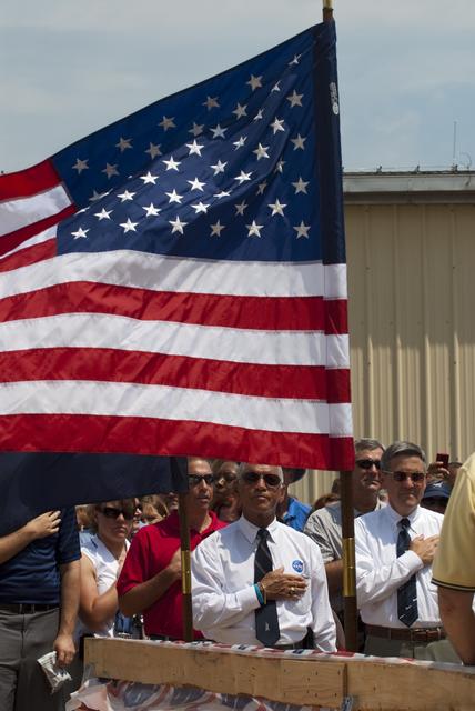 CAPE CANAVERAL, Fla. -- At NASA's Kennedy Space Center in Florida, NASA Administrator Charles Bolden, left, and Kennedy Space Center Director Bob Cabana join Kennedy employees in the Pledge of Allegiance at an employee appreciation event for the thousands of workers who have processed, launched and landed America's space shuttles for more than three decades. Following the successful STS-135 mission, space shuttle Atlantis was parked at the celebration site for photo opportunities. STS-135 secured the space shuttle fleet's place in history and brought a close to NASA's Space Shuttle Program. On board were STS-135 Commander Chris Ferguson, Pilot Doug Hurley, and Mission Specialists Sandra Magnus and Rex Walheim. On the 37th shuttle mission to the International Space Station, STS-135 delivered the Raffaello multi-purpose logistics module filled with more than 9,400 pounds of spare parts, equipment and supplies that will sustain station operations for the next year. STS-135 was the 33rd and final flight for Atlantis, which has spent 307 days in space, orbited Earth 4,848 times and traveled 125,935,769 miles, and also the final mission of the Space Shuttle Program. For more information, visit www.nasa.gov/mission_pages/shuttle/shuttlemissions/sts135/index.html. Photo credit: NASA/Kim Shiflett