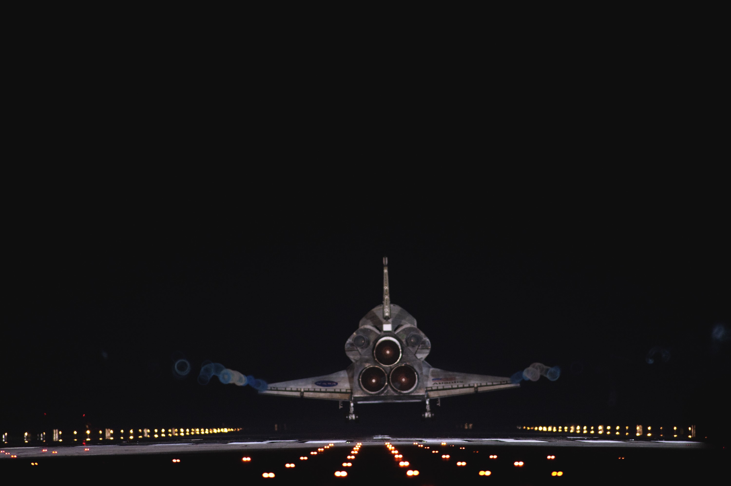 CAPE CANAVERAL, Fla. -- Vapor trails follow space shuttle Atlantis as it approaches Runway 15 on the Shuttle Landing Facility at NASA's Kennedy Space Center in Florida for the final time. A vapor trail, known as a contrail, is a cloud of water vapor that condenses and freezes around the small particles in aircraft exhaust. Atlantis marked the 26th nighttime landing of NASA's Space Shuttle Program and the 78th landing at Kennedy. It also was the final mission for the shuttle program. STS-135 was the 33rd and final flight for Atlantis, which has spent 307 days in space, orbited Earth 4,848 times and traveled 125,935,769 miles. For more information on the space shuttle era, visit www.nasa.gov/mission_pages/shuttle/flyout. Photo credit: NASA/Sandra Joseph and Kevin O'Connell