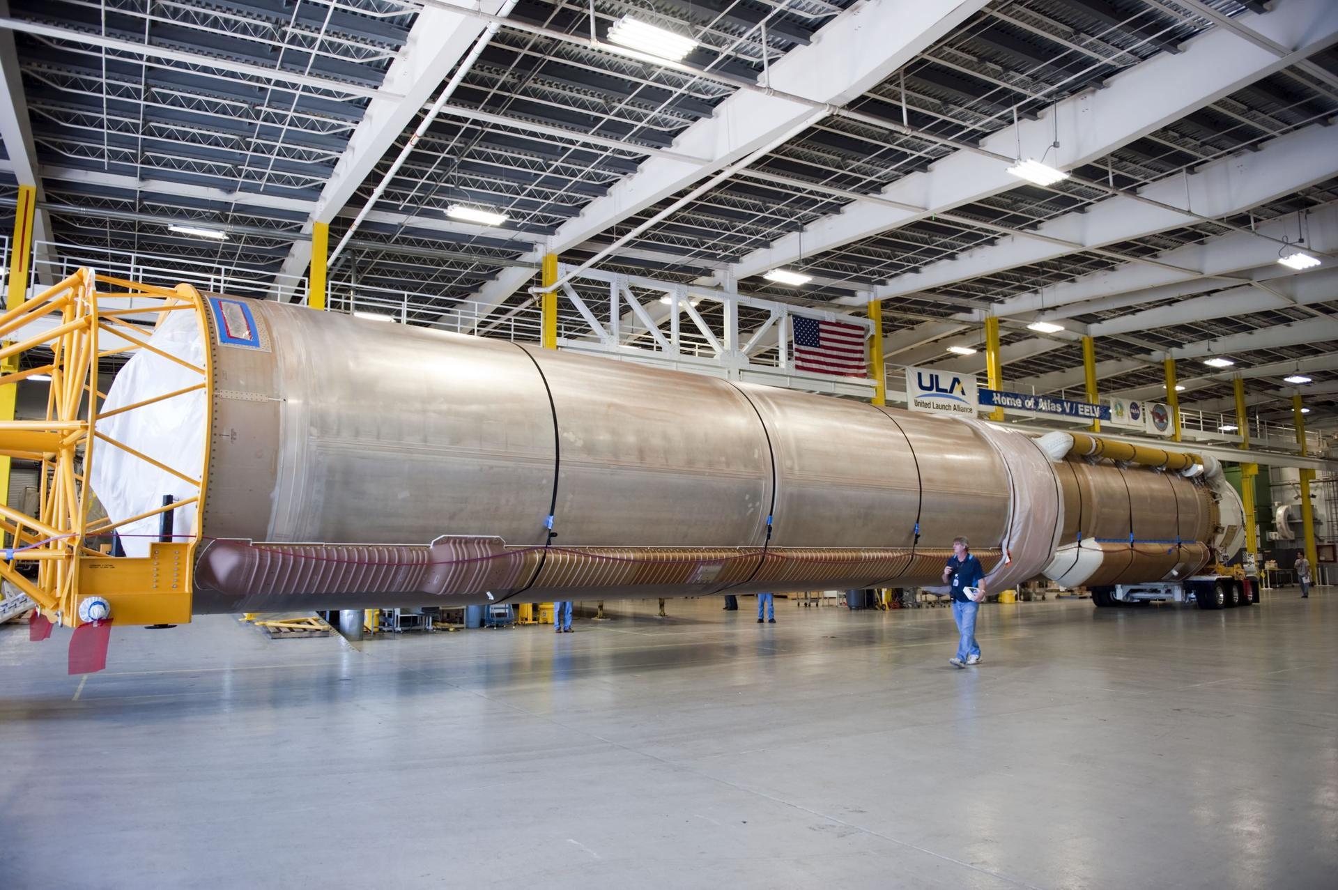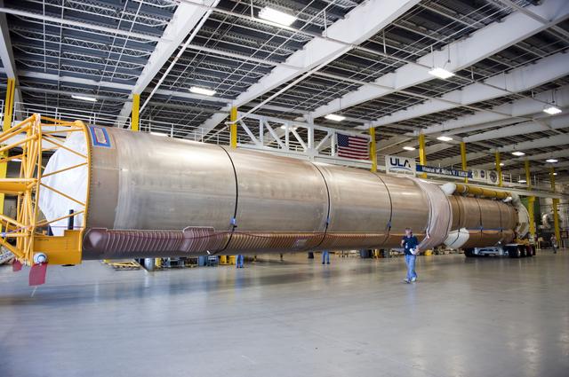 CAPE CANAVERAL, Fla. -- The Atlas V first stage to support the Mars Science Laboratory (MSL) mission is positioned inside the Atlas Spaceflight Operations Center on Cape Canaveral Air Force Station in Florida. MSL's components include a compact car-sized rover, Curiosity, which has 10 science instruments designed to search for evidence on whether Mars has had environments favorable to microbial life, including chemical ingredients for life. The unique rover will use a laser to look inside rocks and release its gasses so that the rover’s spectrometer can analyze and send the data back to Earth. Launch of MSL aboard a United Launch Alliance Atlas V rocket is scheduled for Nov. 25 from Space Launch Complex 41 on Cape Canaveral Air Force Station. For more information, visit http://www.nasa.gov/msl. Photo credit: NASA/Kim Shiflett
