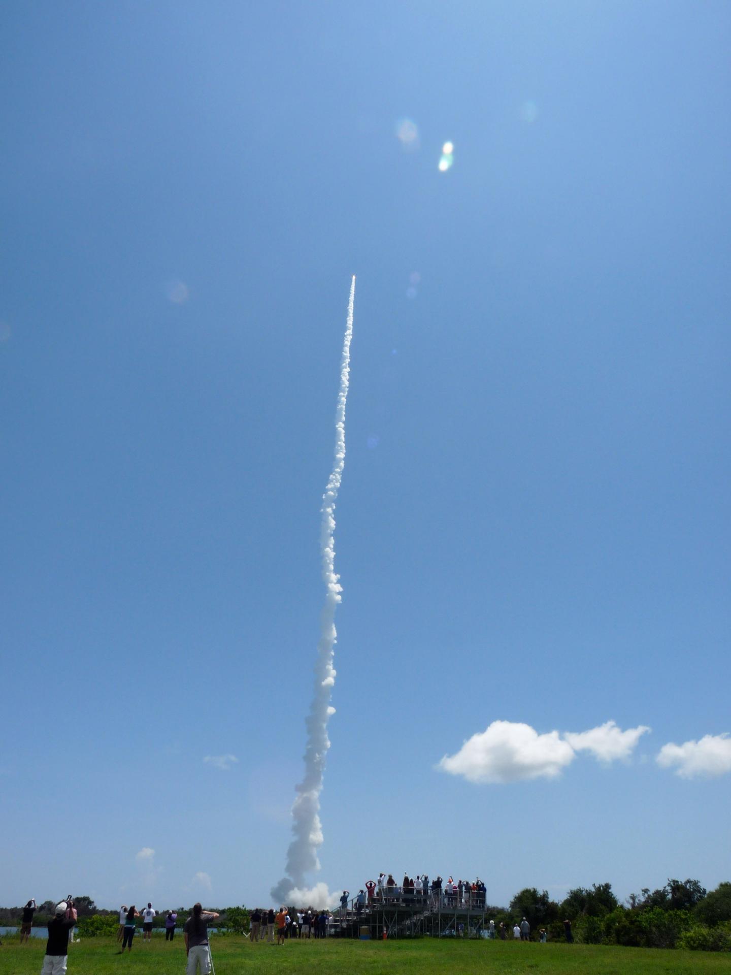 CAPE CANAVERAL, Fla. -- At the Press Site at NASA’s Kennedy Space Center in Florida, about 150 followers of the agency’s Twitter account view the launch of NASA's Juno planetary probe atop a United Launch Alliance Atlas V-551 rocket. The tweeters, in turn, will share their experiences with followers through the social networking site Twitter. Liftoff was at 12:25 p.m. EDT Aug. 5 from Space Launch Complex 41 on Cape Canaveral Air Force Station in Florida. The solar-powered spacecraft will orbit Jupiter's poles 33 times to find out more about the gas giant's origins, structure, atmosphere and magnetosphere and investigate the existence of a solid planetary core. NASA's Jet Propulsion Laboratory, Pasadena, Calif., manages the Juno mission for the principal investigator, Scott Bolton, of Southwest Research Institute in San Antonio. The Juno mission is part of the New Frontiers Program managed at NASA's Marshall Space Flight Center in Huntsville, Ala. Lockheed Martin Space Systems, Denver, built the spacecraft. Launch management for the mission is the responsibility of NASA's Launch Services Program at the Kennedy Space Center in Florida. For more information, visit www.nasa.gov/juno. Photo credit: NASA/Fletcher Hildreth